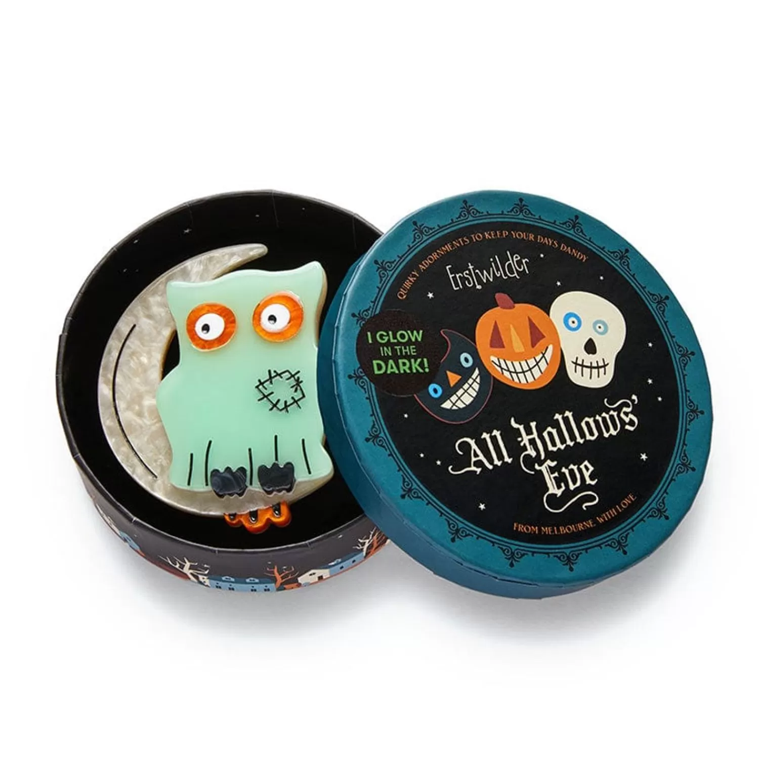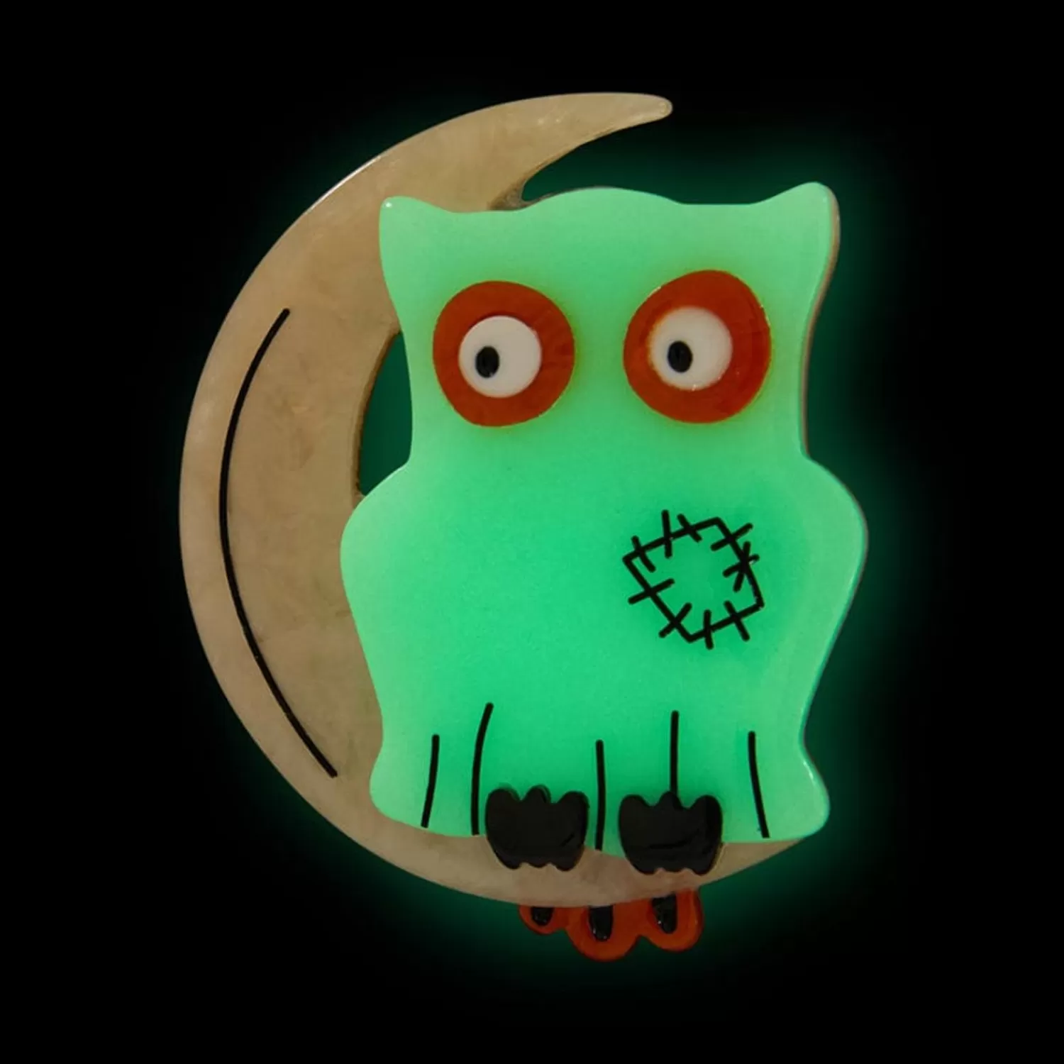 Boo! Hoot! This Haunting A Mostly Ghostly Owl Brooch Has Been Hand-Assembled From Glow-In-The-Dark, Solid And Textured Resins And Features A Combination Of Hand-Painted And Laser-Etched Details. A Part Of Our All Hallows’ Eve Release, This Design Is A Throwback To The Homemade Halloween Primitive Characters Crafted Around The Turn Of The 21St Century, And Purposely References The Patchwork And Hand-Stitched Style That Was Popular At The Time.