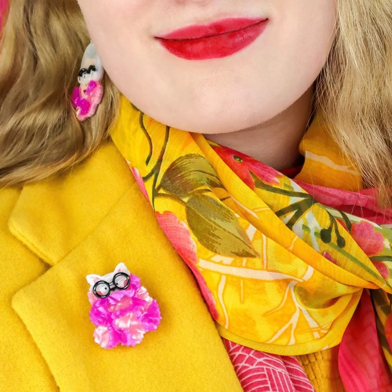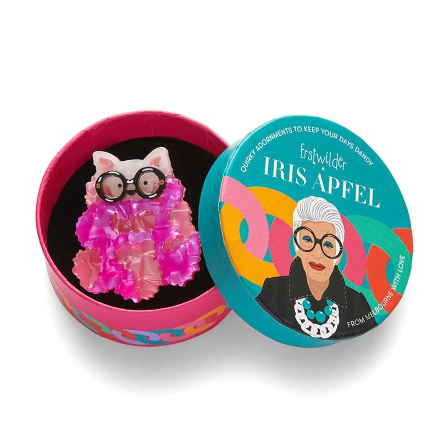 This Erstwilder X Iris Apfel Brooch Showcases Iris’ Iconic Fashion Aesthetic Adopted By A Pom-Pom Wearing Pooch! Hand-Assembled From Stunning Textured Resins, With Hand-Finished Painted Details, Just Like Iris This Design Speaks To The Importance Of Adding A Little Colour To Your Life.