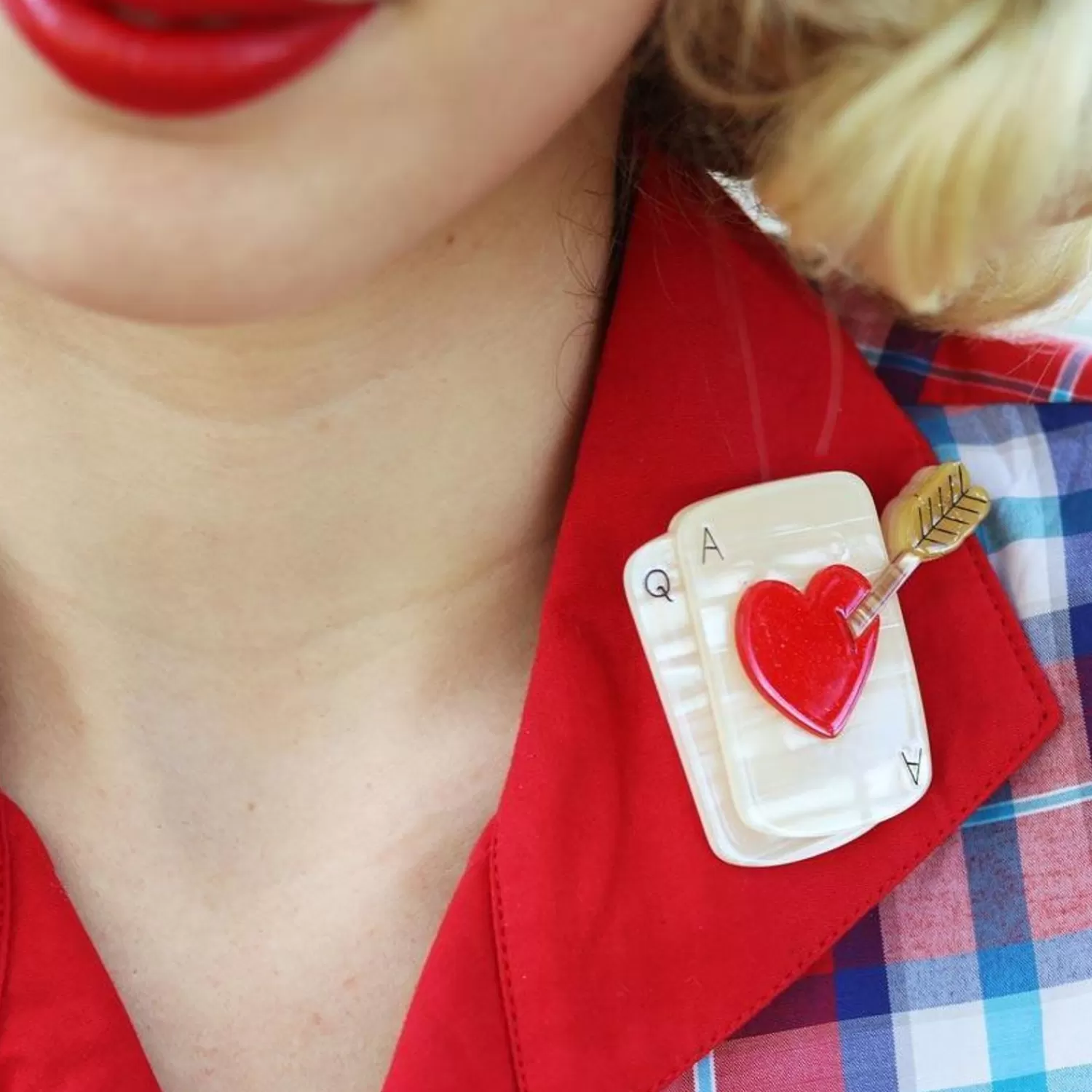 Play The Hand You’Ve Been Dealt With Style And Confidence With Erstwilder’S Our Arrow-Pierced Ace Over Queen Playing Cards Brooch. Hand-Assembled From A Combination Of Glitter And Textured Resins And Featuring Hand-Painted Details, This One’S Is To Be Kept On Your Collar, Not Up Your Sleeve.Original Designer Donna Mizzi
