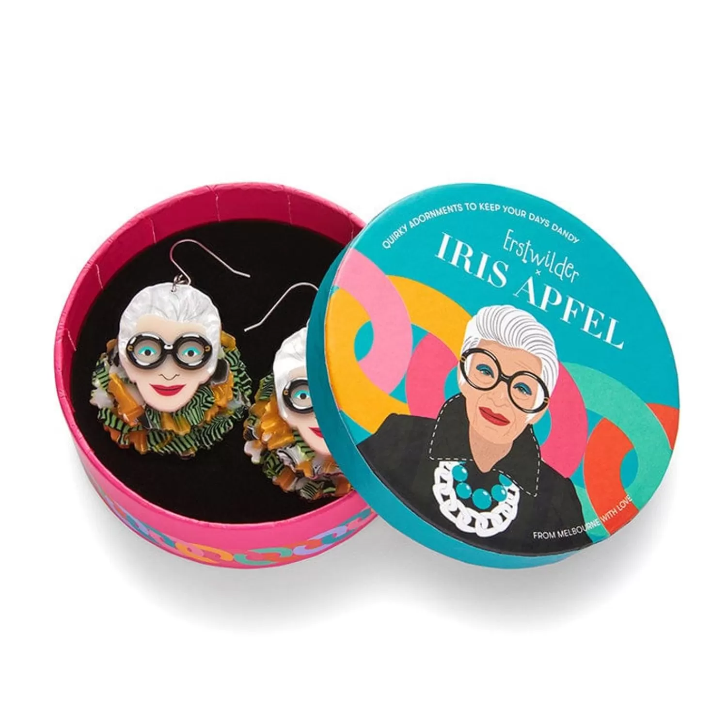 These Official Erstwilder X Iris Apfel Earrings Showcases Iris’ Iconic Portrait Whilst Wearing A Fabulous Feather Boa. Hand-Assembled From A Mix Of Statement Resins, With Laser-Etched Detailing, This Design Perfectly Captures Her Charming Likeness And Speaks To Joy Of Learning Who You Are Through Fashion.