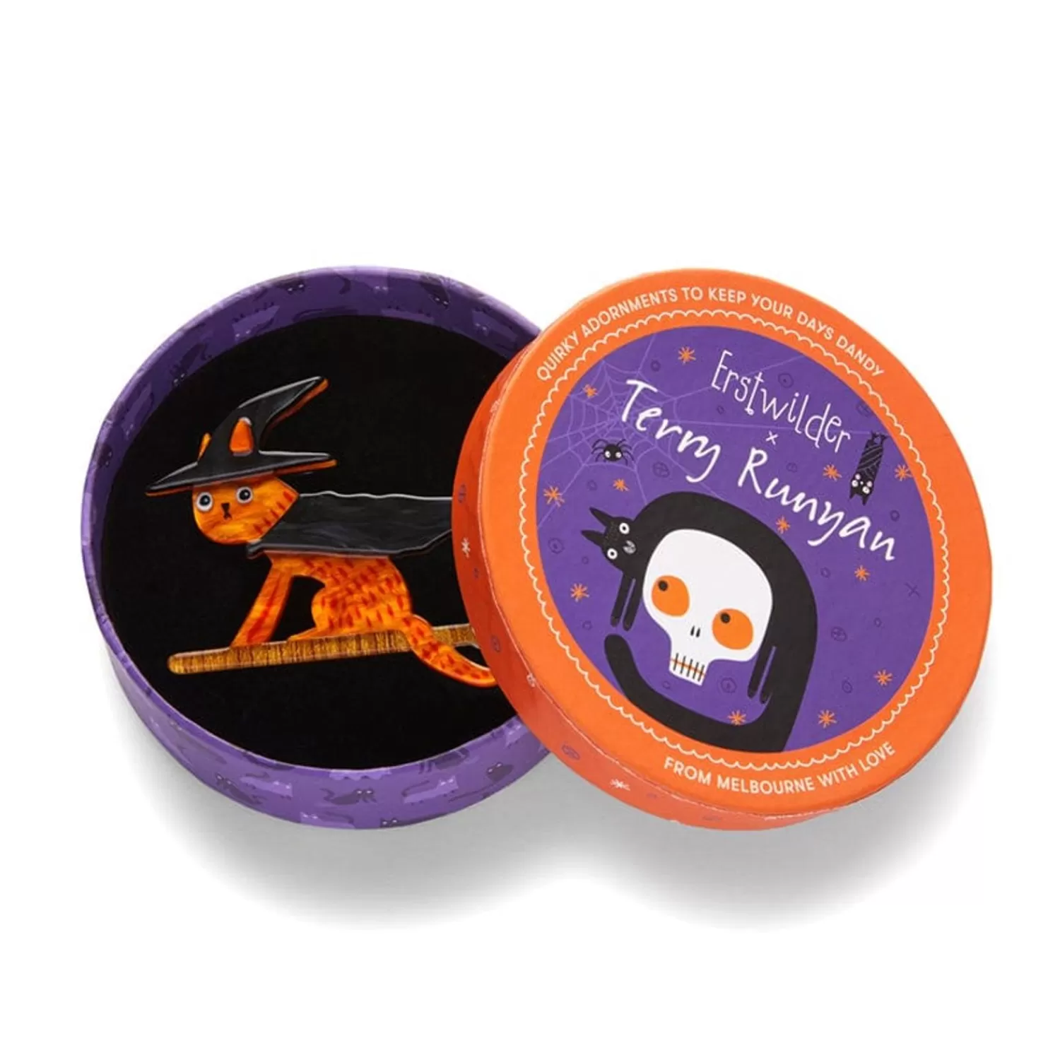 This Erstwilder X Terry Runyan Halloween-Themed Cat Brooch Has Been Hand-Assembled From A Combination Of Textured Resins. With Hand-Painted And Laser-Etched Details Adding Just The Right Amount Of Quirky Character To This Wearable Art Accessory, Bed Knobs &Amp; Broomsticks Is A Frighteningly Fun Way To Upgrade Your Outfit.