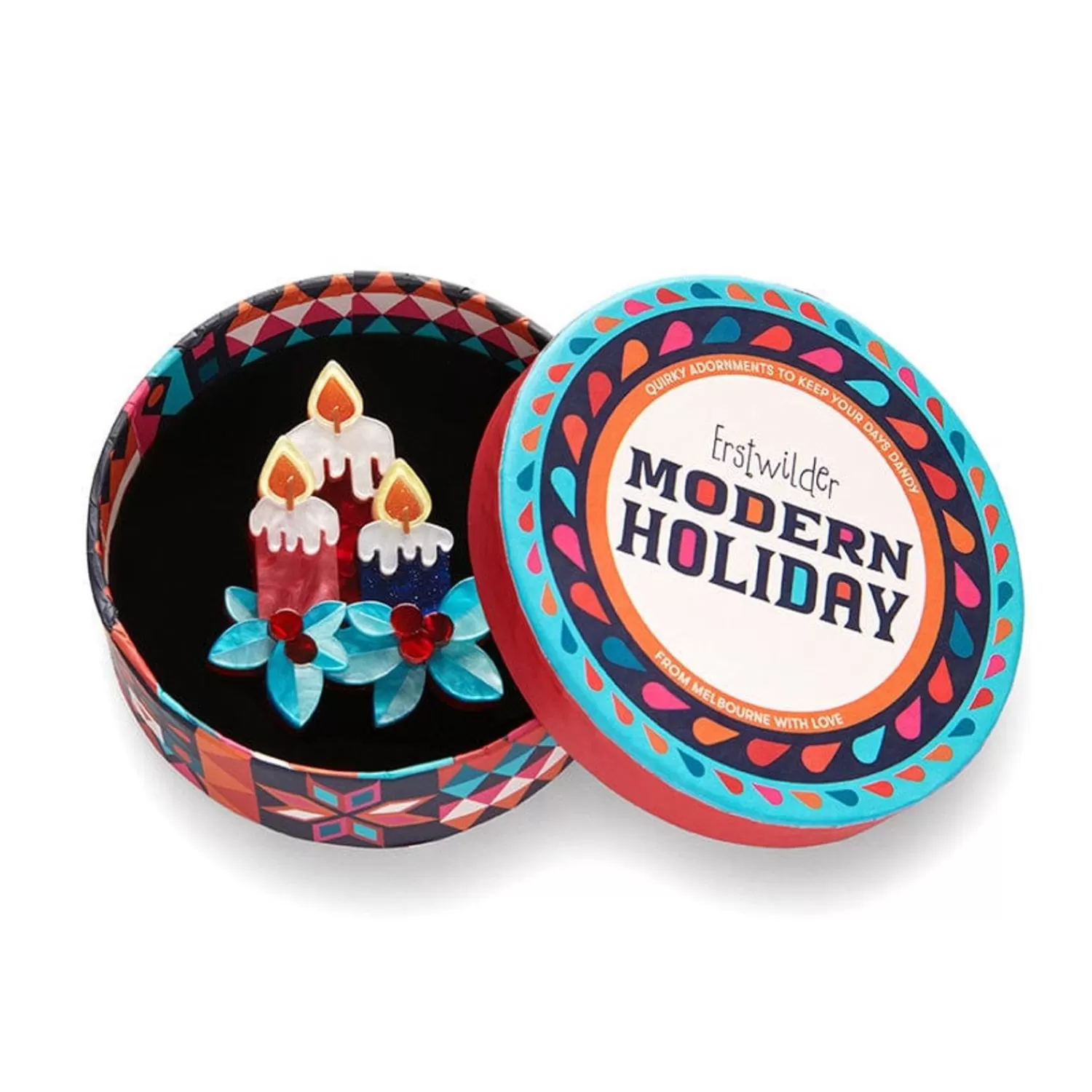 Shine Bright With This Christmas Candle Inspired Brooch! Hand-Assembled From A Mix Of Colourful Textured And Glitter Resins, This Mid-Century Inspired Design From The Modern Holiday Accessories Collection Is The Perfect Adornment To Light Up Your Every Holiday Outfit And Spread Some Festive Cheer. Love This Design? You’Ll Also Discover It Available As An Enamel Pin.