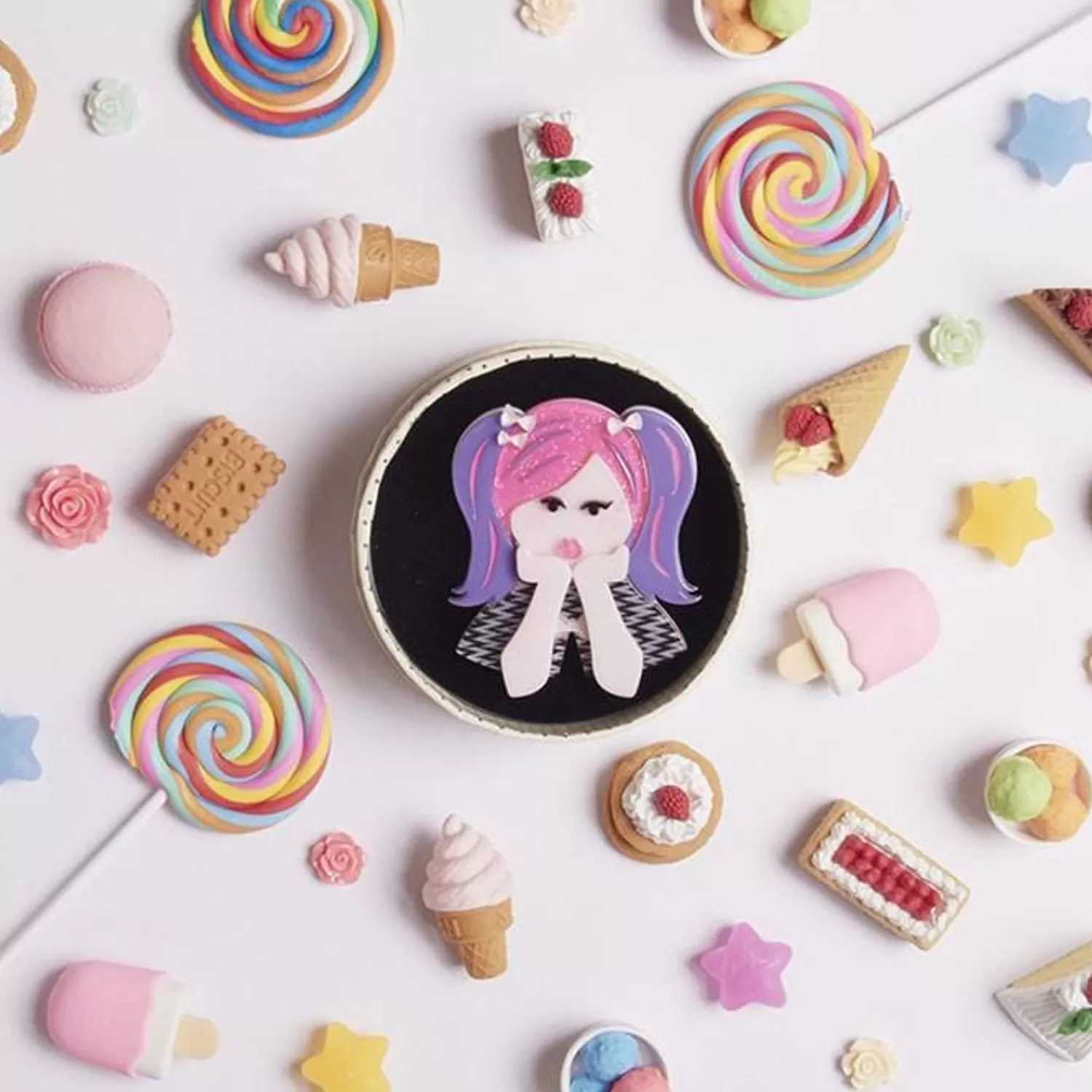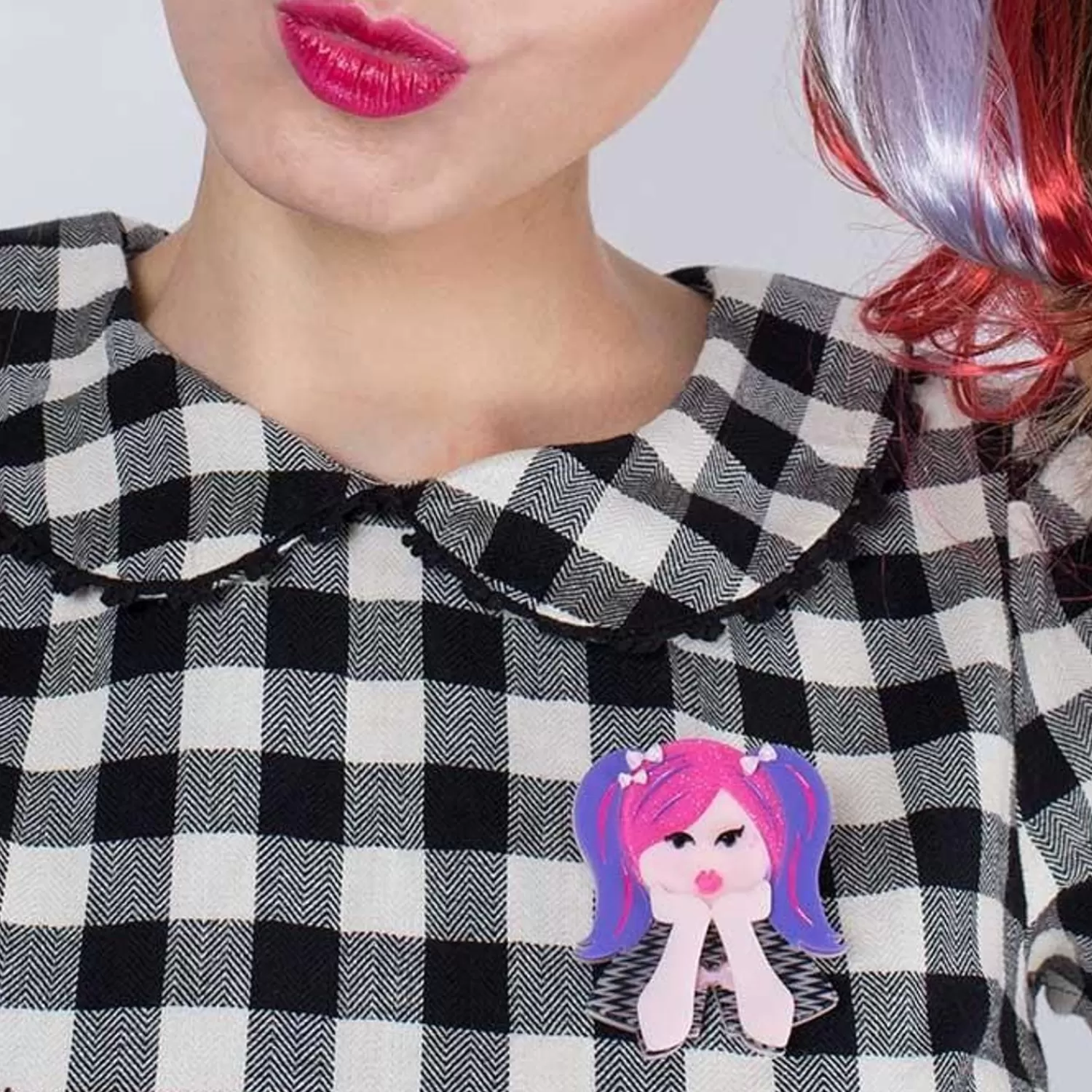 The Archetypal Harajuku Girl Brooch, Complete With Exuberant Locks Of Pink And Purple, Has Been Created From A Combination Of Solid And Patterned Resins. Featuring Hand-Painted Details, She?S Sure To Bring A Bit Of Contemporary Chic To Your Days.Original Designer Carmen Hui