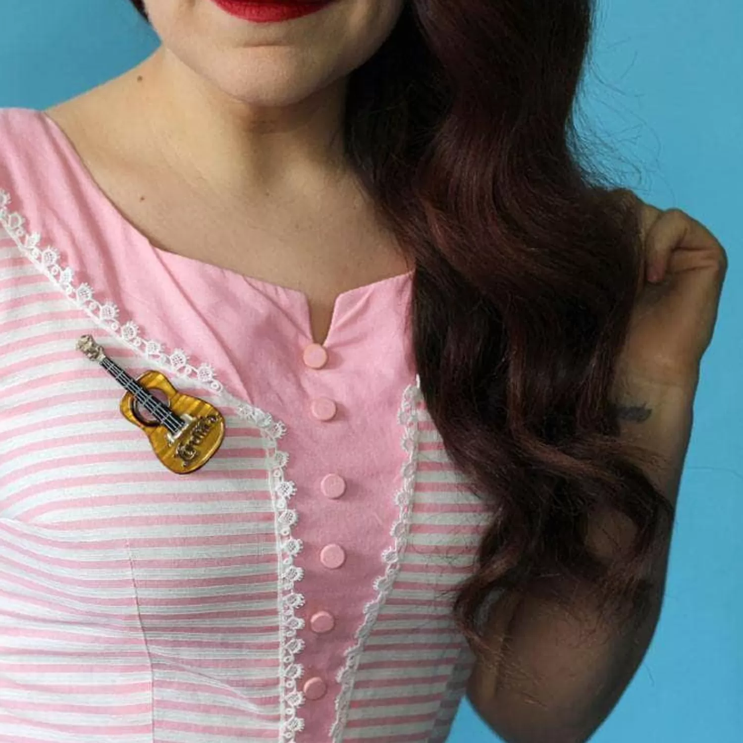 Designed In Collaboration With Junebugs And Georgia Peaches, Strike A Chord With This Guitar Brooch Based On The Own Owned By The Legendary Loretta Lynn. Created From A Combination Of Textured And Solid Resins With Hand-Painted Details, For Those Who Prefer Their Accessories Acoustic. Modelled By @Modernjunecleaver And @Ameliajetson