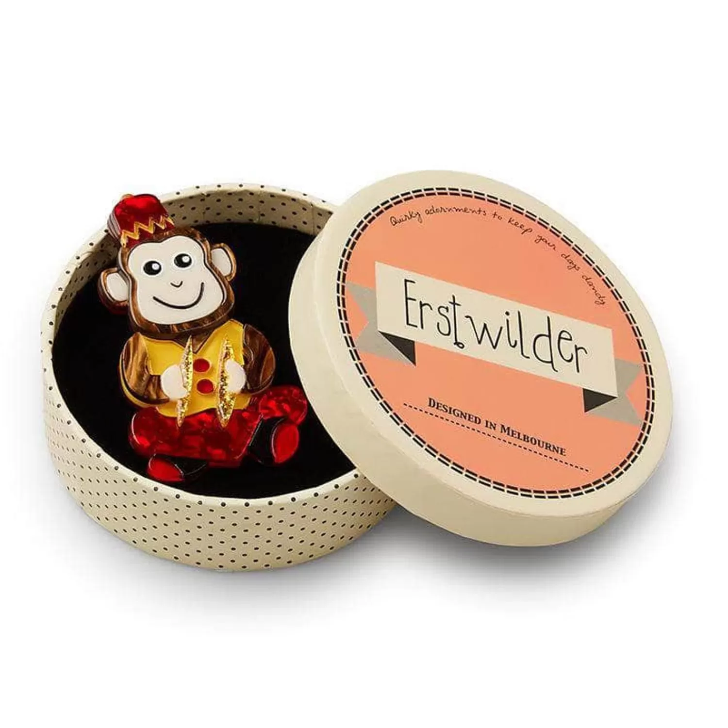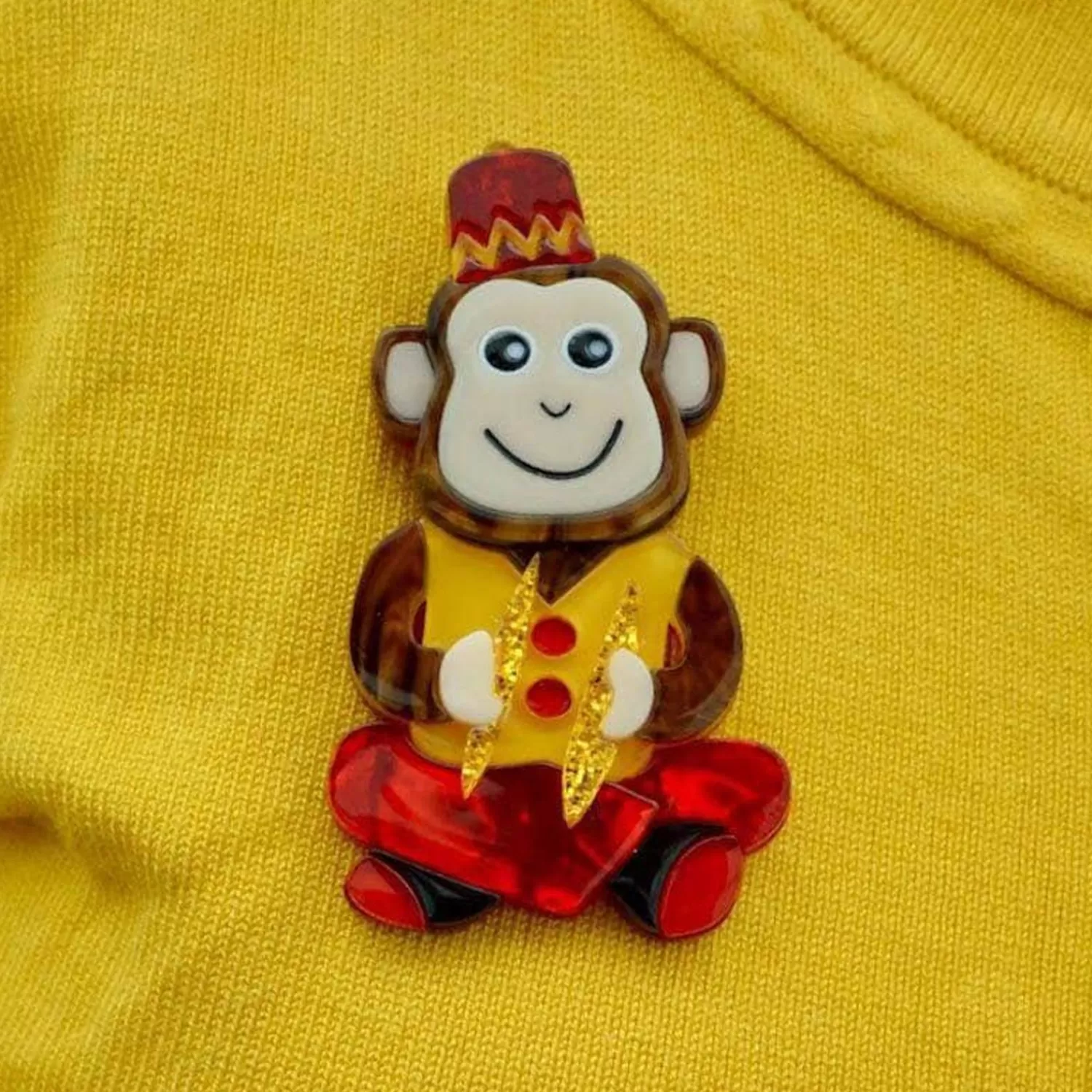 Clap Your Cymbals Together As We Introduce Charley The Chimp. Our Charley Brooch Has Been Hand Assembled From A Combination Of Textured And Glitter Resins And Features Hand-Finished Details. Wear Him With Your Best Outfit, His Hat Will Look Great With Yours!Original Designer Carmen Hui