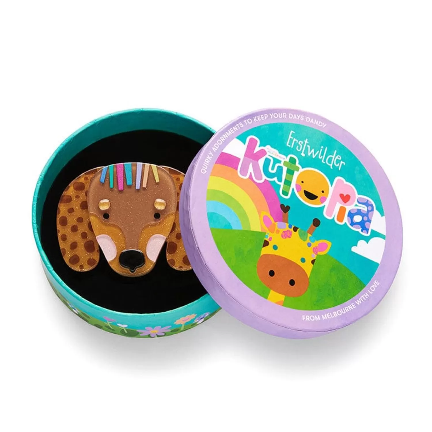 This Erstwilder X Kasey Rainbow Darcy The Dachshund Brooch Has Been Hand-Assembled From A Combination Of Colourful Resins And Finished With Hand-Painted Details. A Resident Of The Wonderful World Of Kutopia, Darcy’S Diminutive Size Doesn’T Quite Reflect Her Big Personality. Wear Her With Her Matching Hair Clips Or When Carrying Around Her Complementary Compact To Complete The Ensemble.