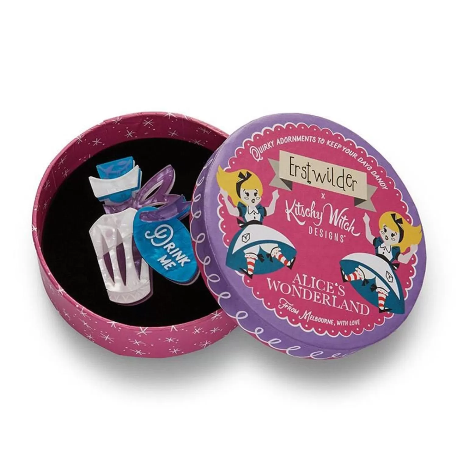 Part Of Our Alice’S Wonderland Collaboration With Kitschy Witch, This Hand-Assembled Drink Me Potion Brooch Uses Beautiful Blue And White Resins And Features Hand-Painted Details. Pair It With The Eat Me Cookie Mini Brooch Or One Of The Other Wonderful Pieces From The Collection.