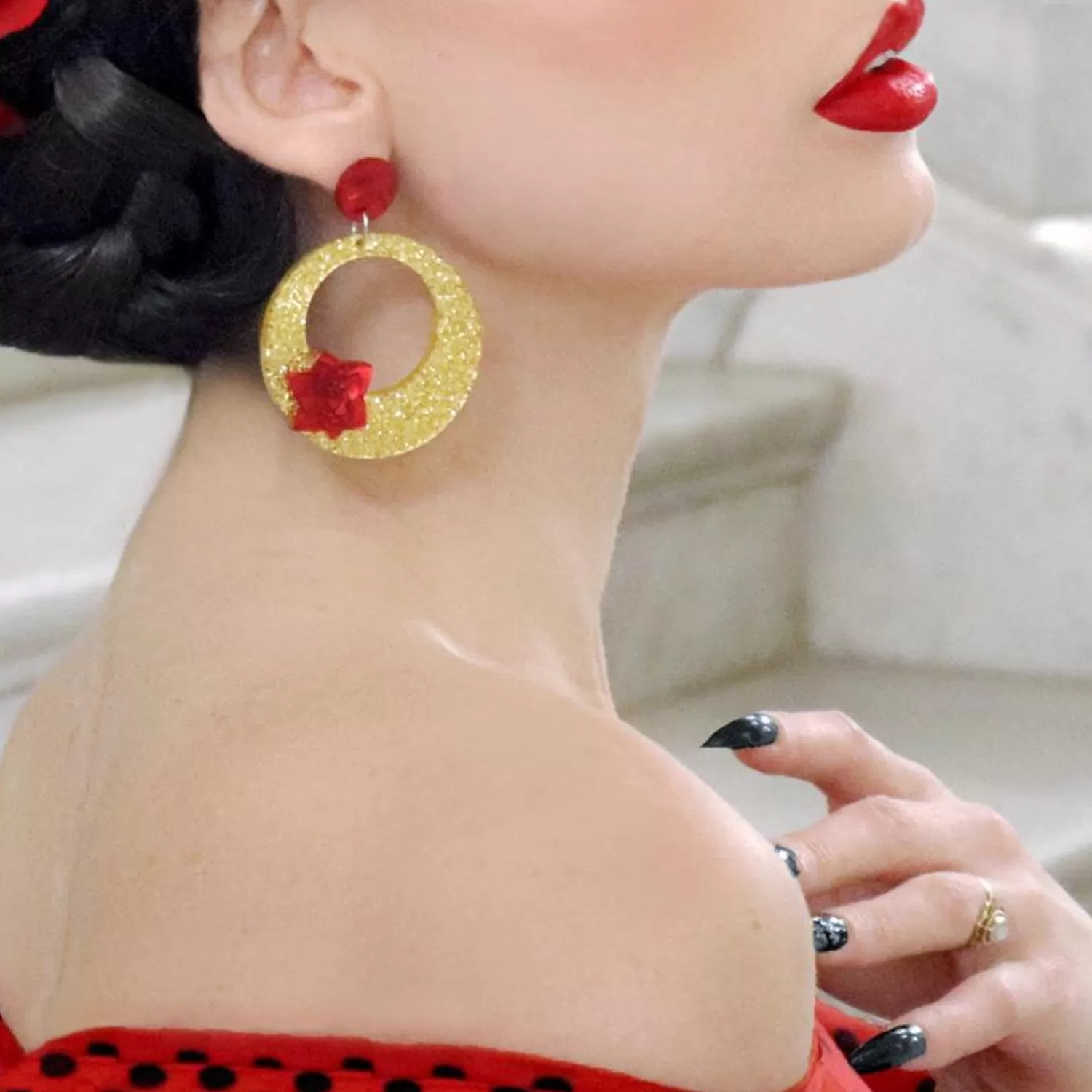Is There Anything More Fun And Fashionable Than A Pair Of Glittering Hoops Adorned With Roses? We Couldn’T Think Of Anything Either! With A Combination Of Glittery Gold, And Ravishing Textured Red Resins, Our Hand-Assembled Hoops Will Put Some Spanish Fiesta Into The Most Overcast Days.