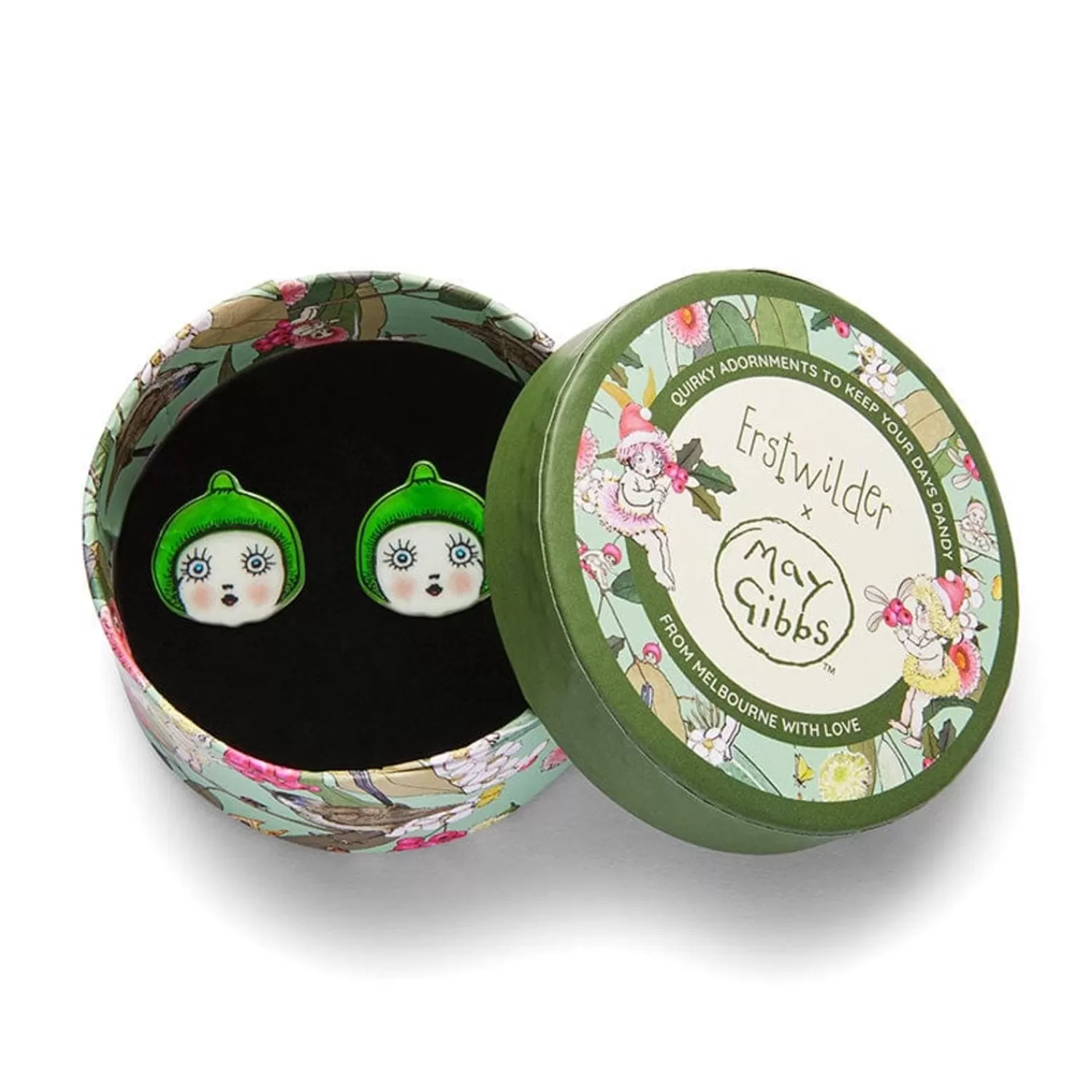 Part Of Our 2023 Erstwilder X May Gibbs Collection, These Gumnut Babies Stud Earrings Have Been Caringly Constructed From Layered Resins And Finished With A Combination Of Printing And Highly Detailed Line Work. A Product Of The Imagination Of One Of Australia’S Most-Beloved Artists, These Mischievous Nuts Really Do Mean Well.