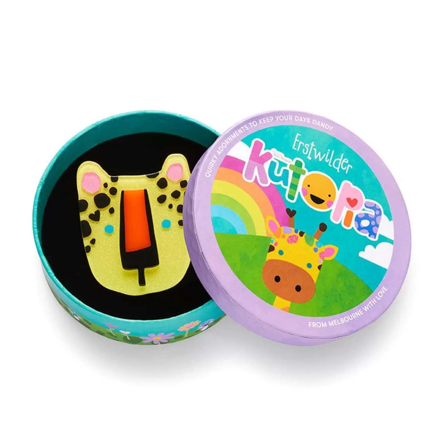 This Erstwilder X Kasey Rainbow Leo The Leopard Brooch Has Been Hand-Assembled From A Combination Of Colourful Resins And Finished With Hand-Painted Details. A Resident Of The Wonderful World Of Kutopia, Leo Is Never That Difficult To Spot, Because He Has No Reason To Hide. Wear Him With His Matching Necklace Or When Carrying Around His Complementary Compact To Complete The Ensemble.