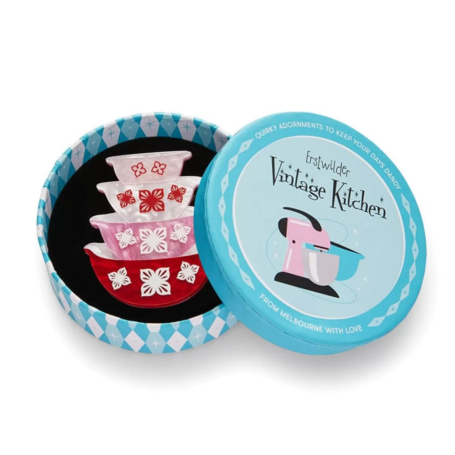 It’S Your Set Of Classic, Vintage-Inspired Mixing Bowls, Made Into Wearable Accessories! Express Your Love For All Things Kitchen And Baking Related With The Nanna’S Prized Flower Bowls Brooch, Hand-Assembled From Pink, Red And Textured White Resins. Love This Design? You’Ll Also Find It Available As Earrings, And Its Aqua Blue Counterpart As A Brooch, Earrings And Enamel Pin, While Stocks Last.