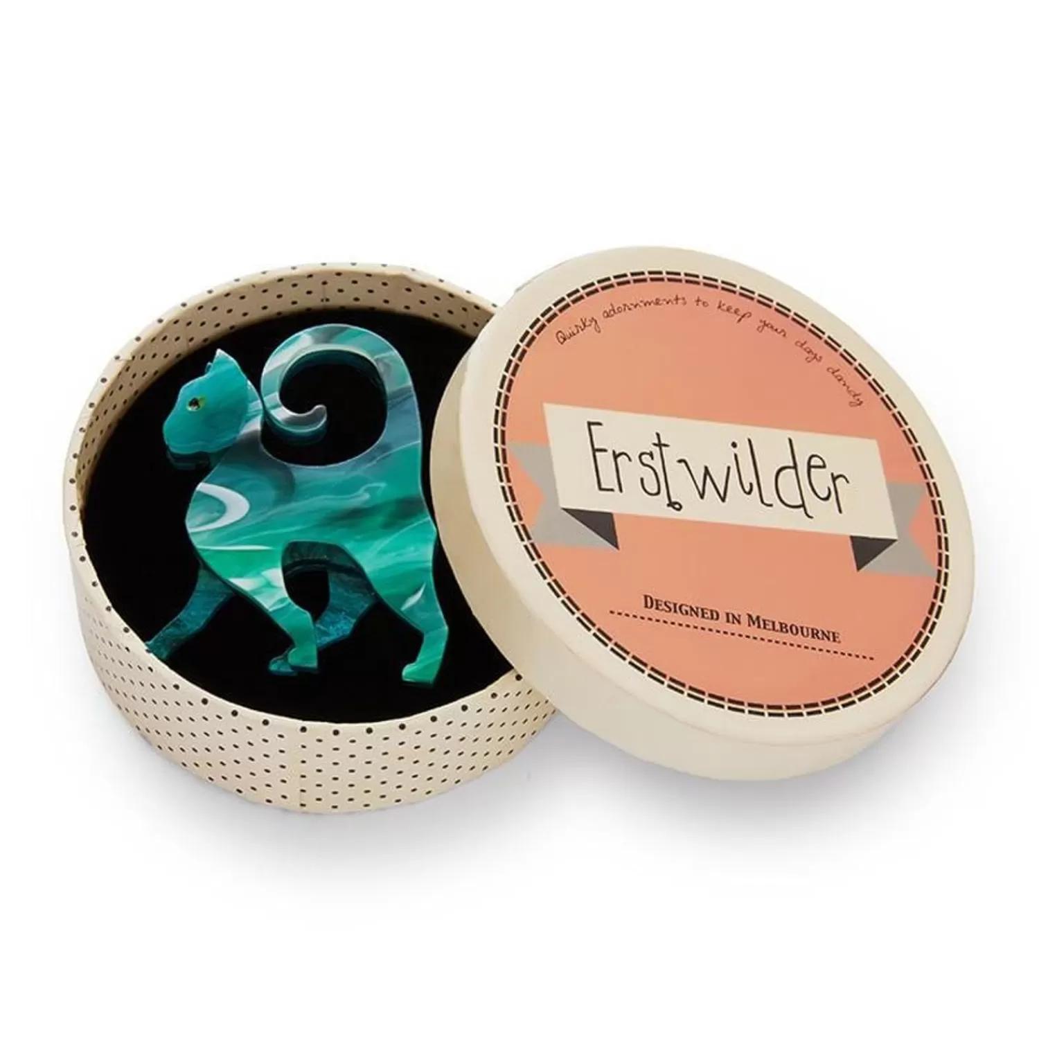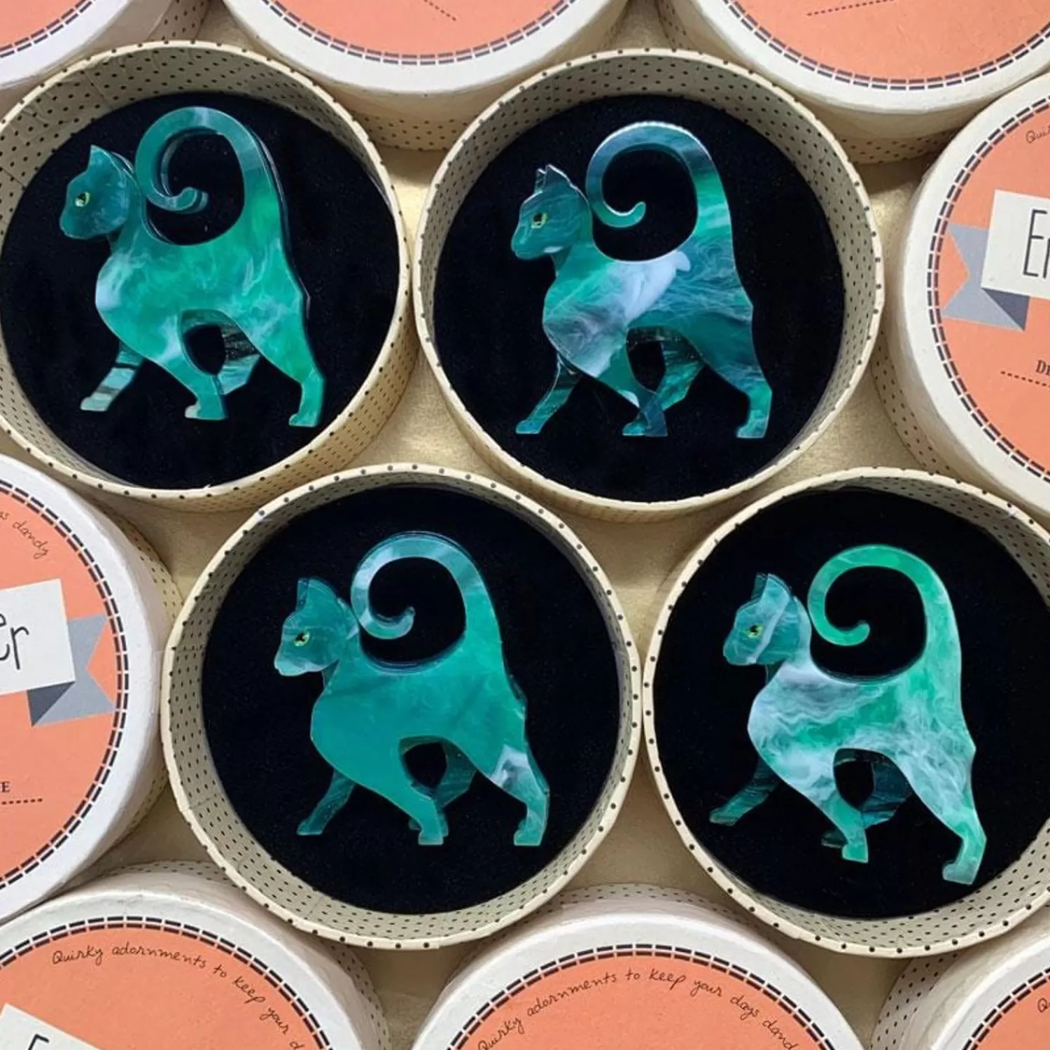 Please Note Each Piece May Differ From One To Another, And To The ‘On The Prowl Cat’ Brooch Pictured. The ‘On The Prowl Cat’ Brooch Features A Unique Green Marbled Resin, The Colours Can Vary From A Rich Jade Hue, To Lighter Green Colours, With More Pronounced White Ribbons. Just Like Real Marble Each Pattern Is Different And Makes Each Brooch Totally Individual And Unique.