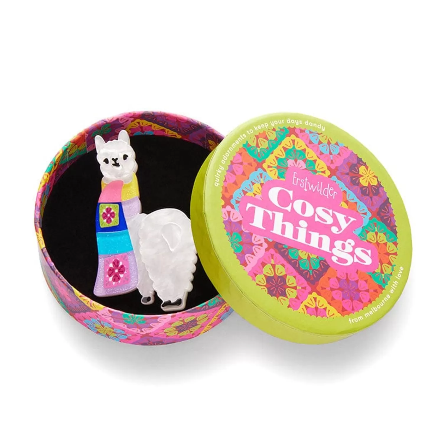 Nanna’S Knitting Hobby Has Been Turned Into Wearable Resin Art With This Alpaca In A Scarf Brooch From Our Cosy Things Collection. Hand-Assembled From Colourful Resin, With Laser-Etched Details And Classic Erstwilder Charm, Pack A Scarf Is A Darling Adornment And Is One Of Three Pet-Related Pieces In This Release.