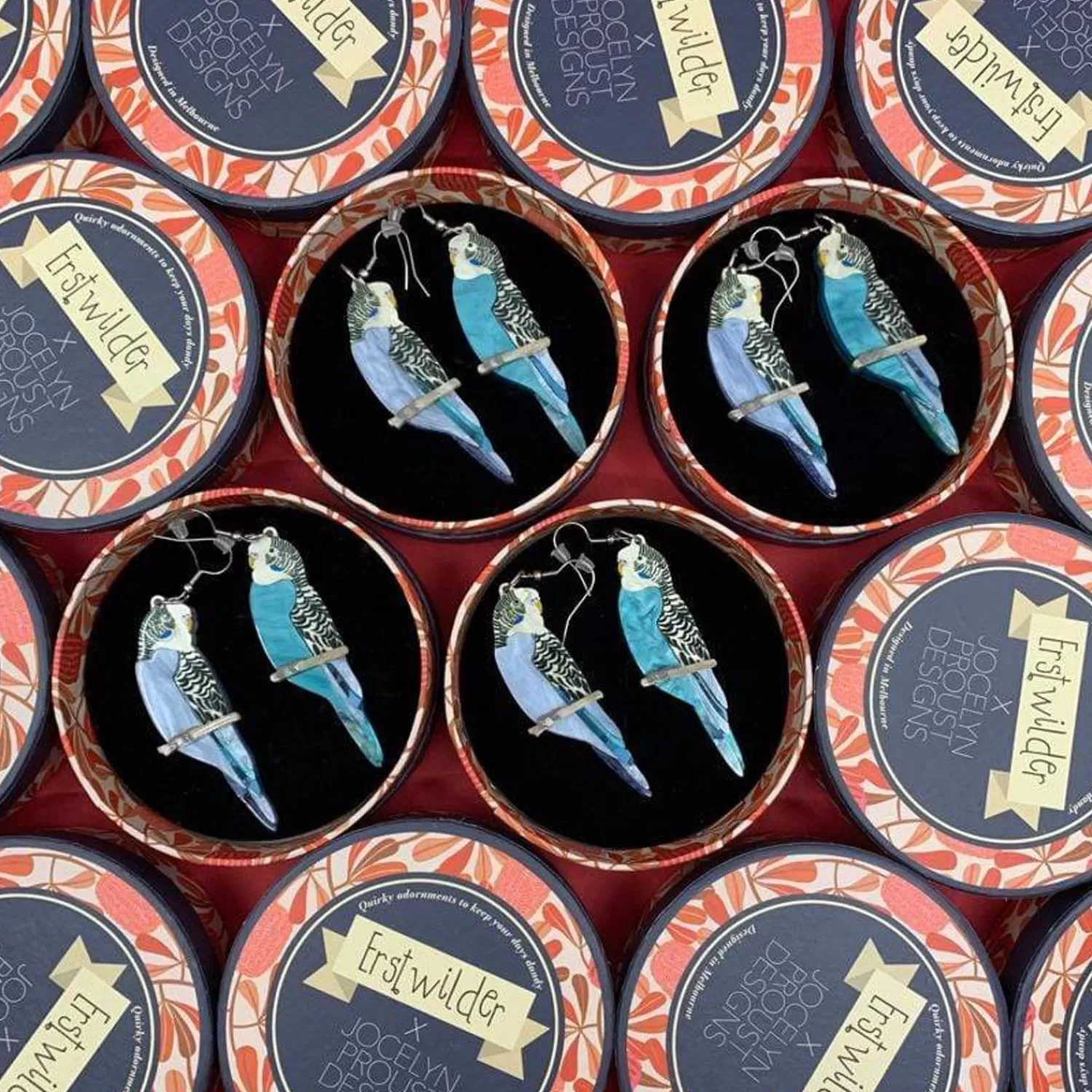 They’Ll Talk Your Ears Off, These Two. This Perching Budgerigars Necklace Has Been Hand-Assembled From Ripple And Marble Resins And Features Hand-Painted Details.92Mm X 69Mm (H X W)Pair O’ Keets Earrings*Erstwilder Flash Sale