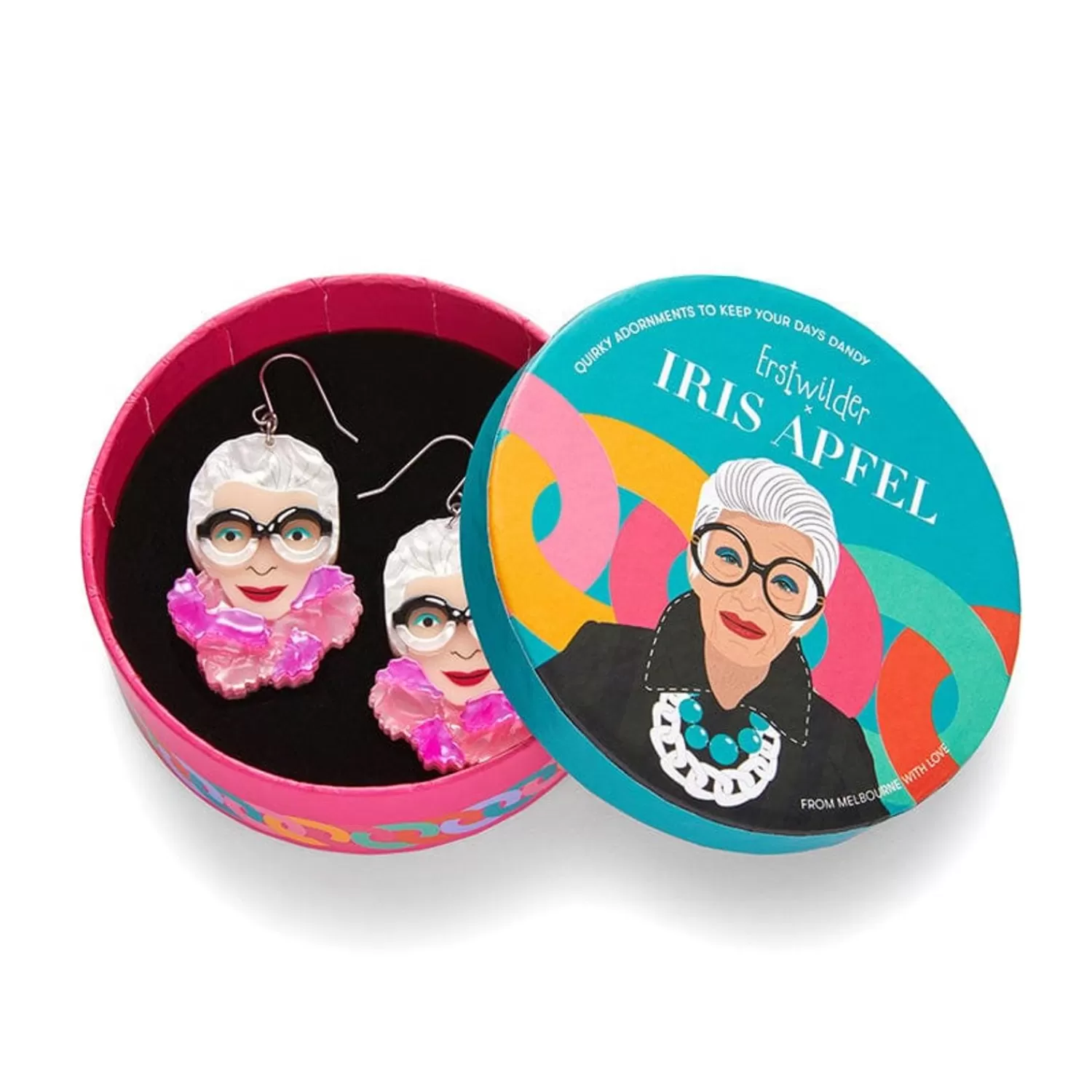 These Official Erstwilder X Iris Apfel Drop Earrings Showcase Iris’ Iconic Portrait, Whilst Wearing A Bold And Colourful Pink Pom-Poms! Hand-Assembled From A Mix Of Gorgeous Resins, With Laser-Etched Detailing, This Charming Design Captures Her Likeness And Speaks To The Importance Of Owning Your Style.