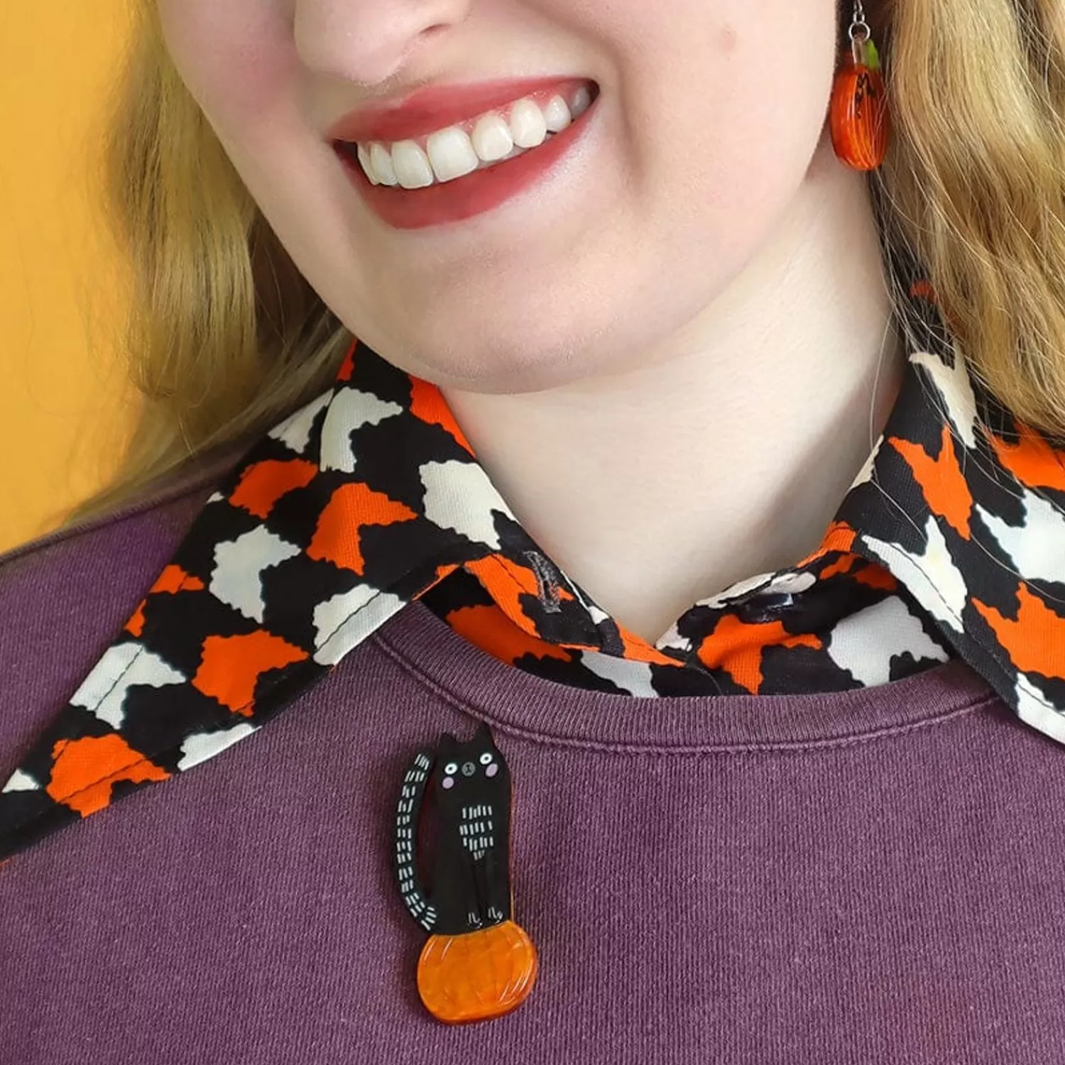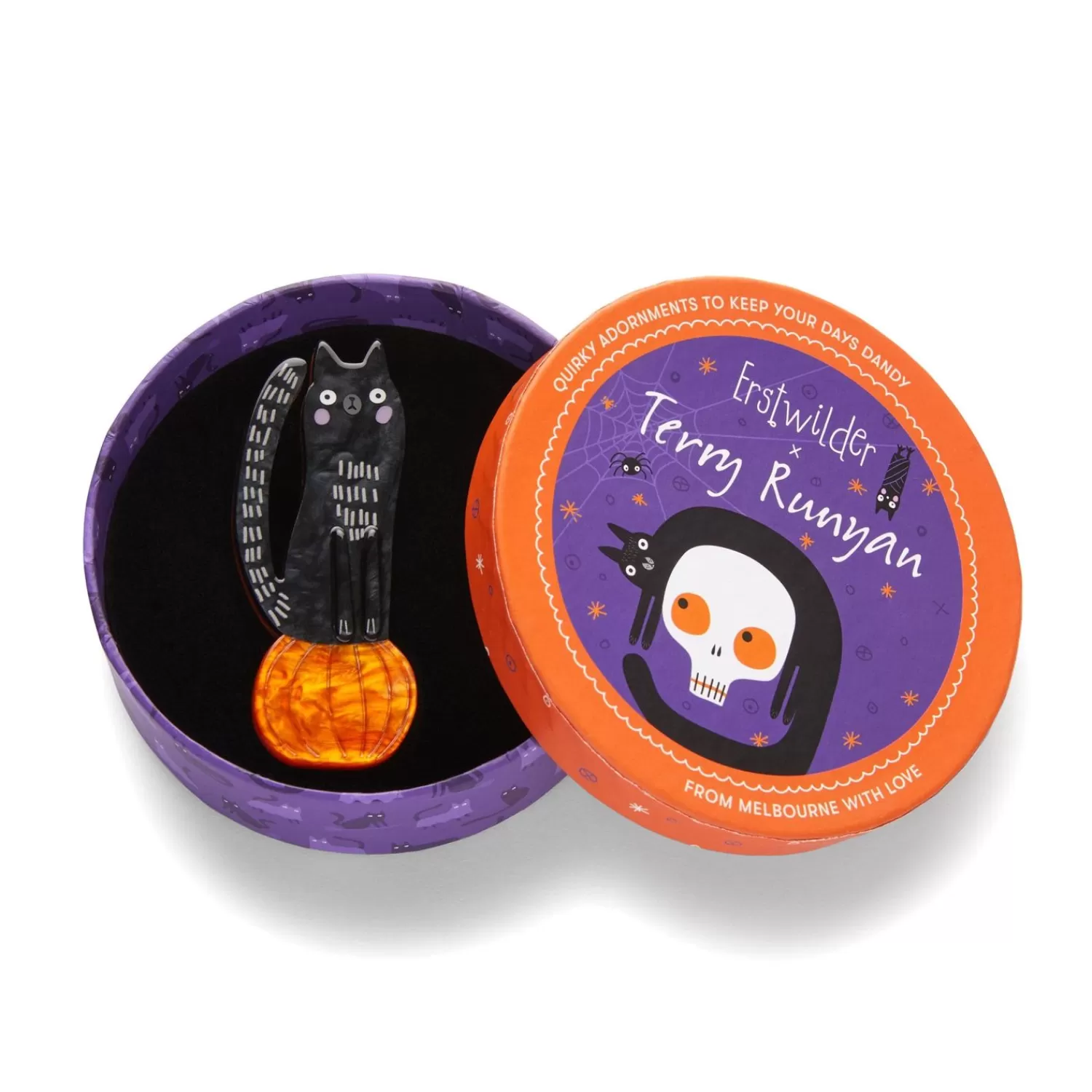 This Erstwilder X Terry Runyan Halloween-Themed Cat Brooch Has Been Hand-Assembled From Textured Resins. With A Combination Of Hand-Painted, Printed And Laser-Etched Details Adding Just The Right Amount Of Quirky Character To This Wearable Art Accessory, Pumpkin Time Kitty, Despite Her Reputation, Is An Excelllent All Hallows Omen.