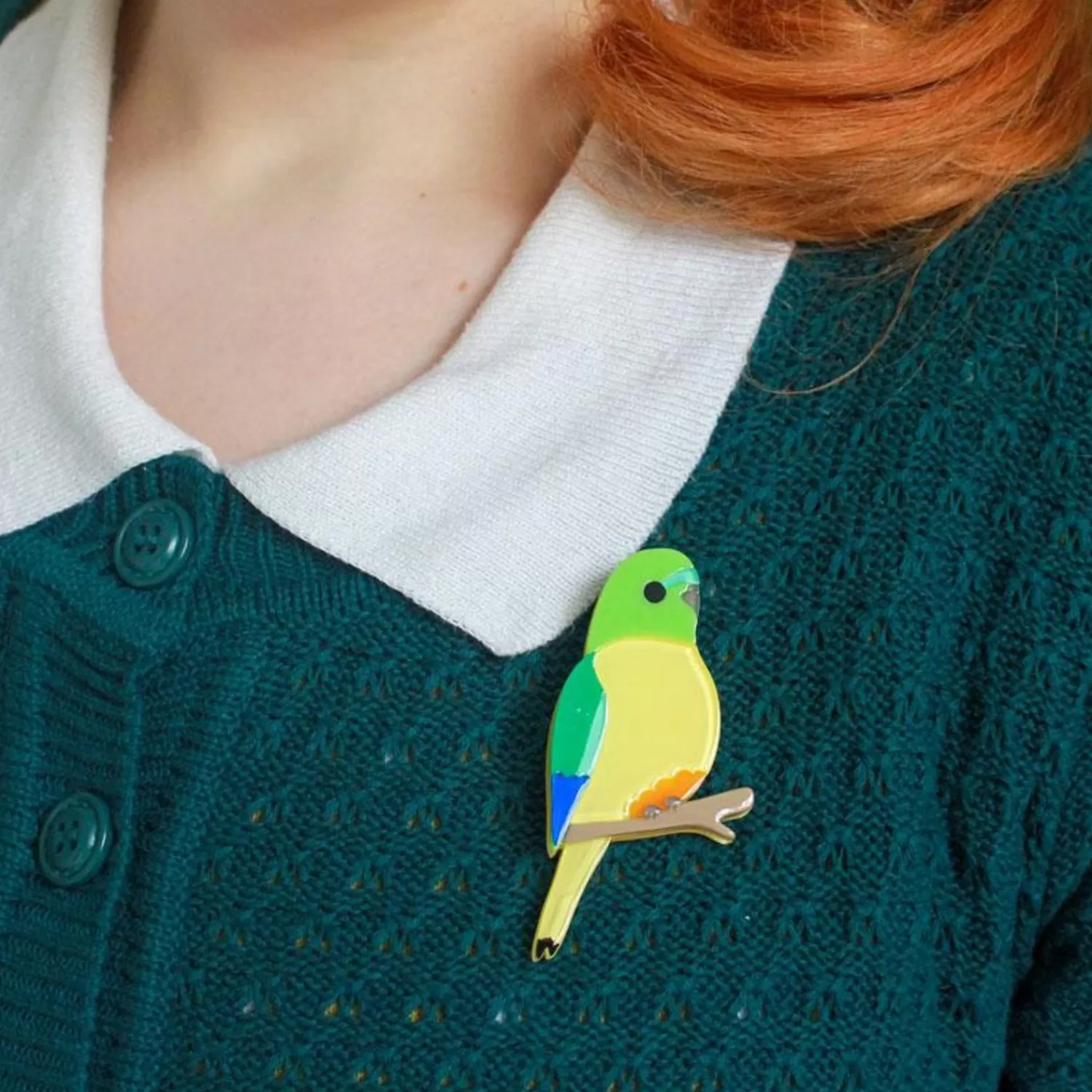 Just Like One Of Only Three Species Of Parrot To Migrate, We Love A Holiday Too! Bright Bubble Resin Adorns Our Little Bird Brooch, As Well As Hand-Painted Details Bringing It To Life. With A Squawk And A Chirp, This Orange Bellied Parrot, Will Bring A Little Brightness To Any Outfit, Match It With Our Kakapo Brooch For Some Feathery Fun.