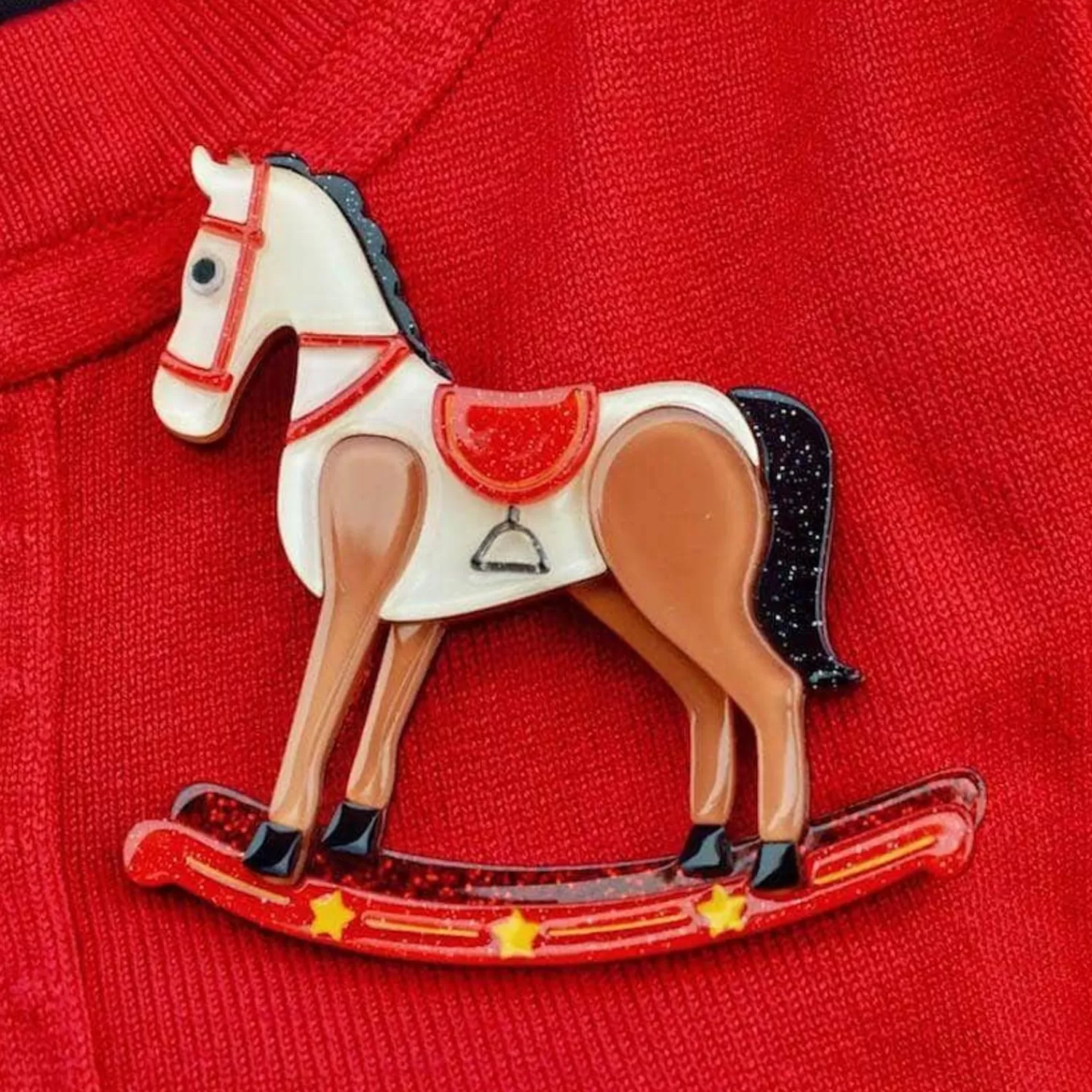 Giddy Up And Canter With Us Across The Grassy Planes, The Only Boundaries Are Your Own Imagination. Our Rocking Reminisce Brooch Combines Solid And Glitter Resins, Hand-Painted Details And One Luxurious Mane. First Appearing In The 17Th Century The Rocking Horse Is Still A Childhood Favorite To This Day.