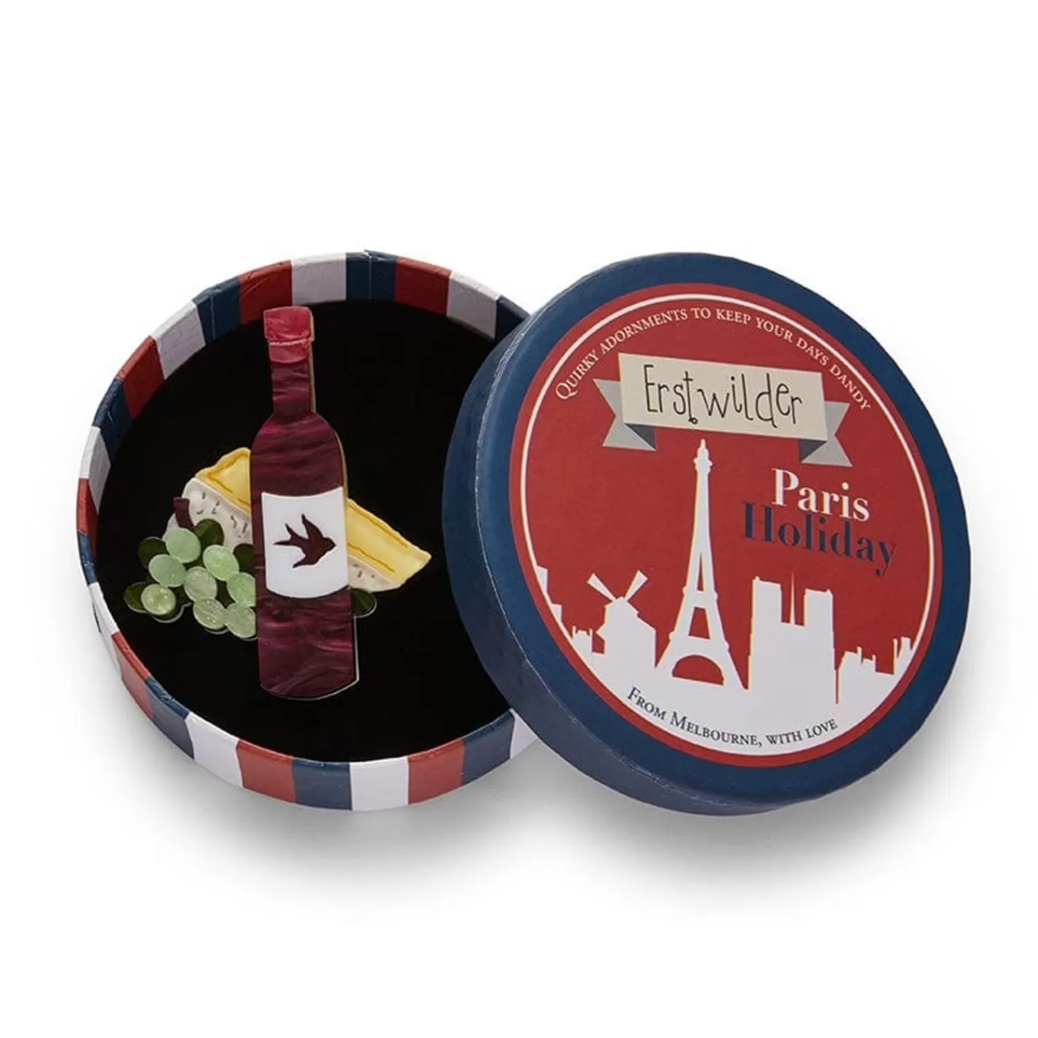A Tribute To Two Staples Of French Cuisine, This Mixed Resin Brooch Features Features Grapes, Cheese And Erstwilder’S Very Own Brand Of Wine – Now All You Need Is The Corkscrew.