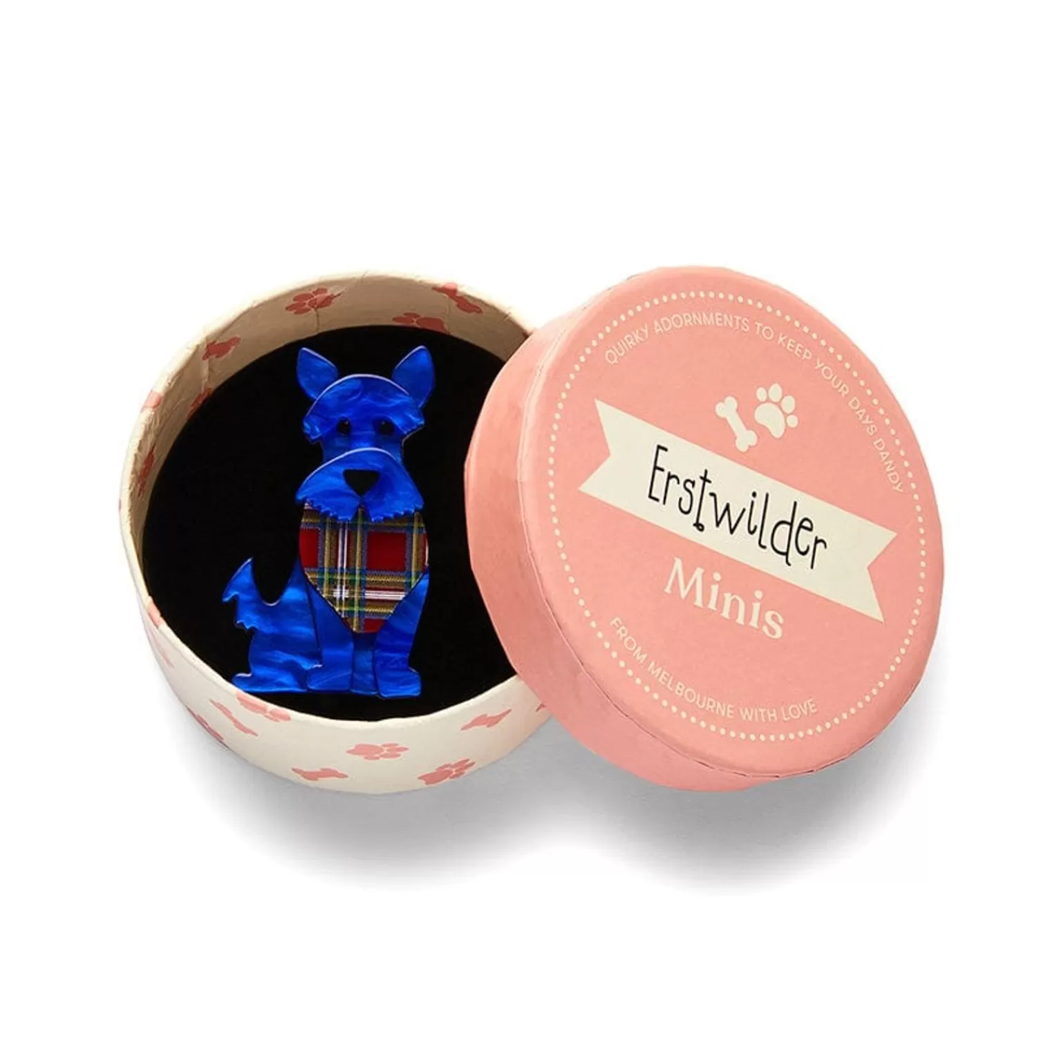 Scooter The Scotty Makes His Latest Erstwilder Appearance With With A Rather Fancy New Tartan Printed Scarf And Bold Blue Resin, Reduced To ‘Mini’ Brooch Size For Perfect Pairings. A Happy Hound To Complete Any Outfit, Scotty Can’T Wait To Come Home With You! Shop This Delightful Dog Brooch For Yourself Or Make It A Meaningful Gift For Any Scotty Dog Lover In Your World. Available Strictly While Stocks Last.