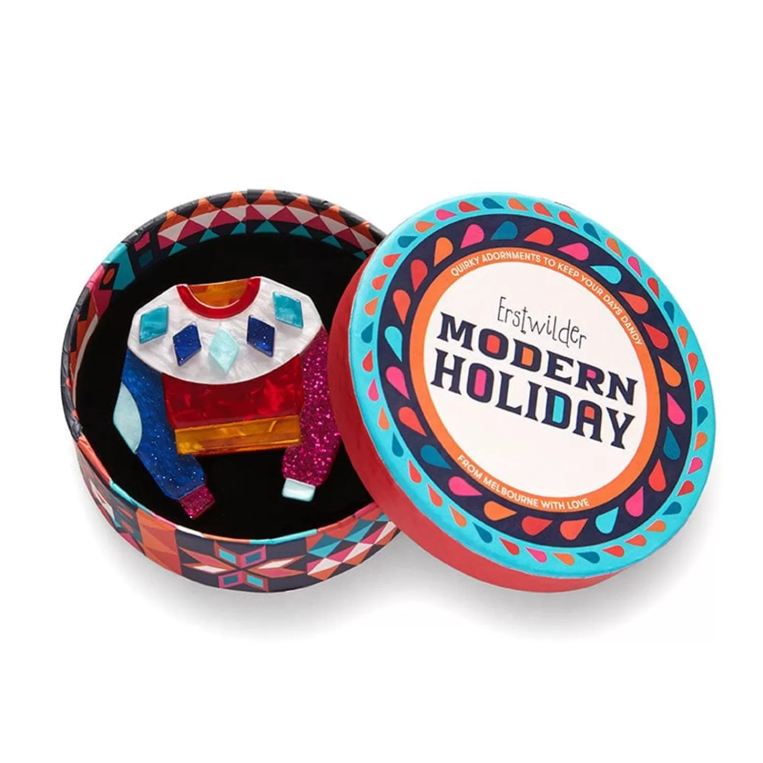 Ugly Sweaters? We Don’T Believe There’S Anything Ugly About This Seasonal Sweater-Inspired Brooch. And, Being Gorgeous As It Is, It’S A Perfectly Fashionable Fashion Accessory All Year Round. Part Of The Modern Holiday Collection, This Design, Featuring A Mid-Century Aesthetic Has Been Hand-Assembled From A Mix Of Colourful Textured And Glitter Resins With Inset Pieces. Love This Design? You’Ll Find It Available As A Statement Resin Necklace And Enamel Pin.