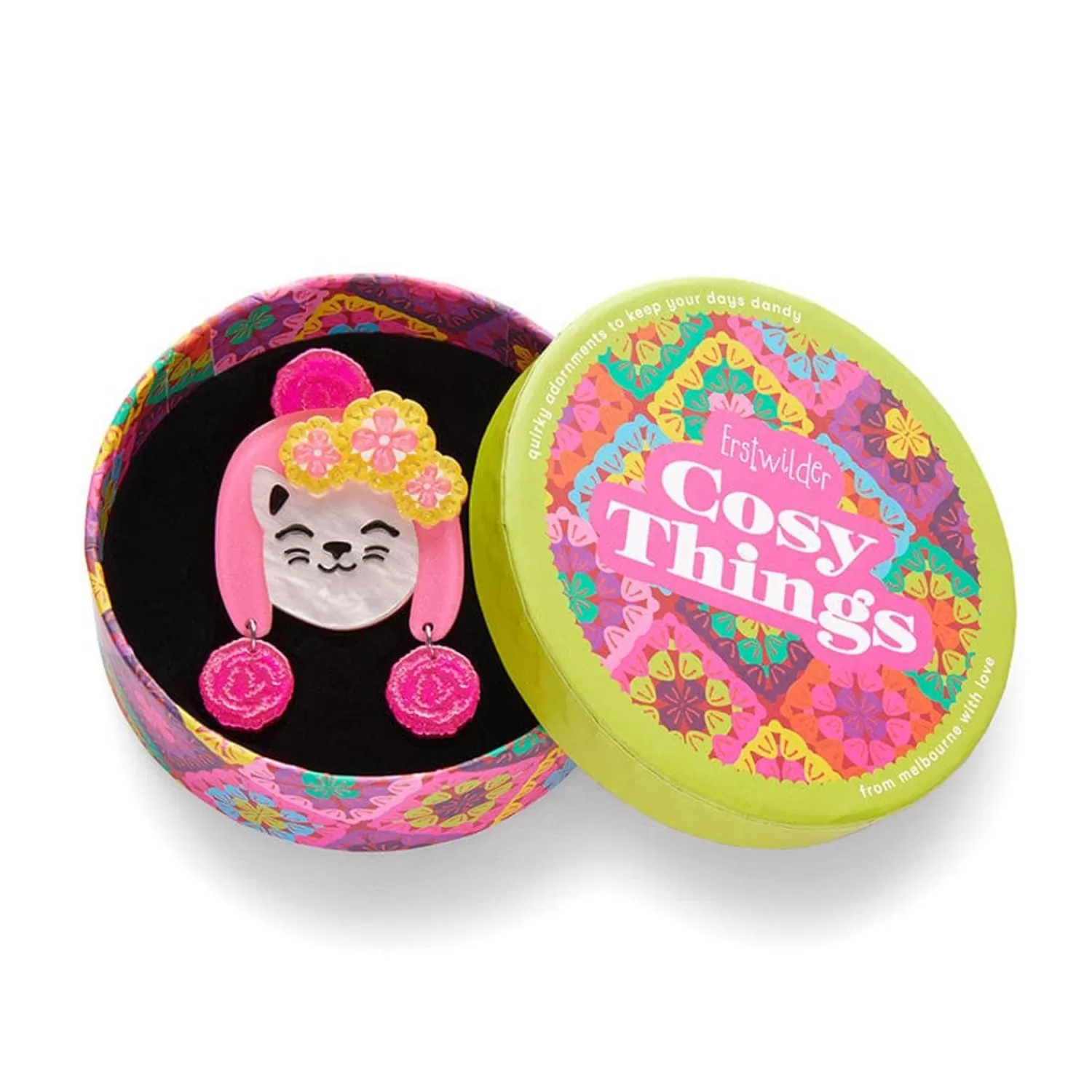 Nanna’S Knitting Hobby Has Been Turned Into Wearable Resin Art With This Cat In A Crochet Hat Brooch From Our Cosy Things Collection. Hand-Assembled From Colourful Resin, With Laser-Etched Details And Classic Erstwilder Charm, Snug Fit Kitty Is Warm And Fuzzy Feelings That Can Be Worn On Any Outfit And Is One Of Three Pet-Related Pieces In This Release.