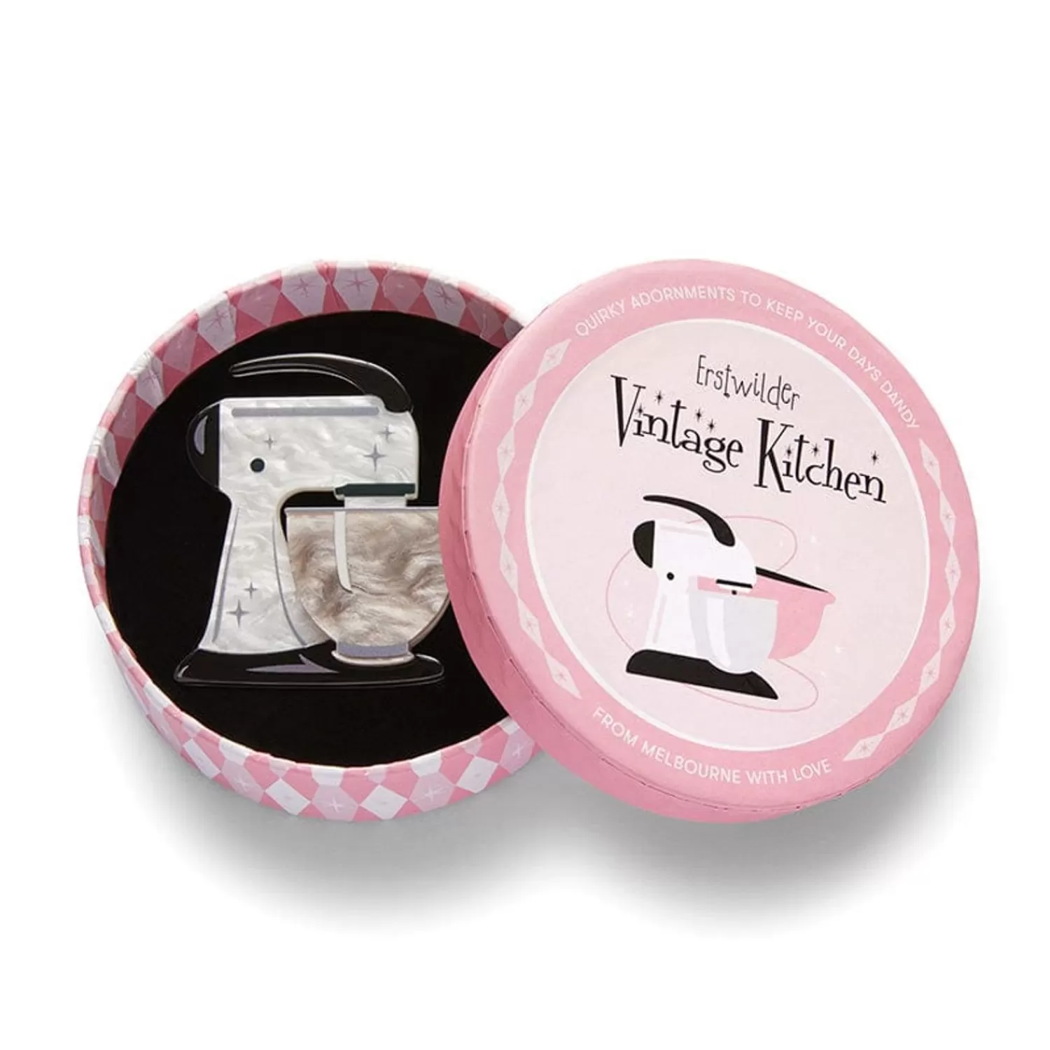 Step Back Into The Heart Of The Home With This Nostalgia-Inducing White Stand Mixer Brooch, Part Of The Second Vintage Kitchen Release. Hand-Assembled From Resin And Finished With A Combination Of Printing, Epoxy And Etching, This Retro-Future Spin Me Right Round Design Is Also Available In A Variety Of Other Colours To Match Your Own Mixers And Your Style.