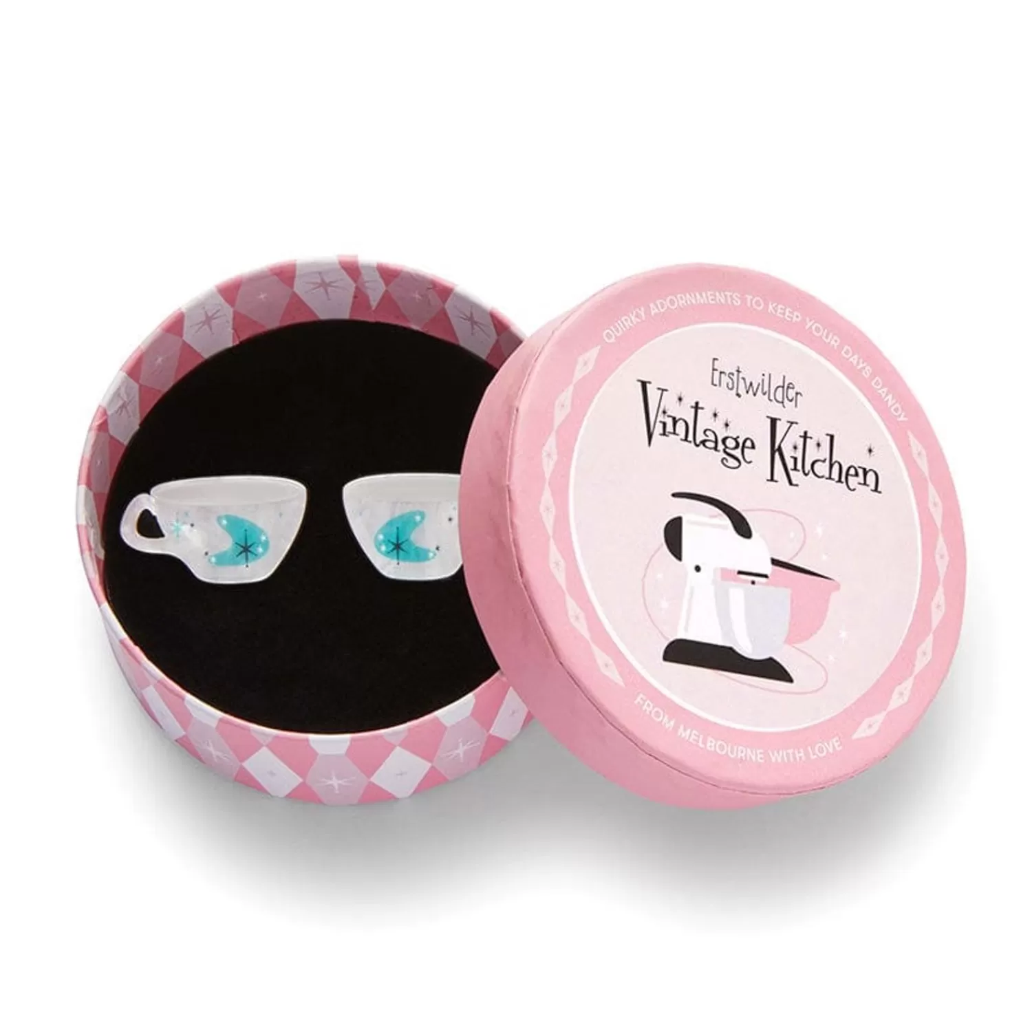 Step Back Into The Heart Of The Home With This Nostalgia-Inducing Atomic Tea Cup Stud Earrings, Part Of The Second Vintage Kitchen Release. Hand-Assembled From Resin And Finished With Printing, A Similar Version Of This Retro-Future Tea And Sympathy Design Is Also Available As A Hard Enamel Pin.
