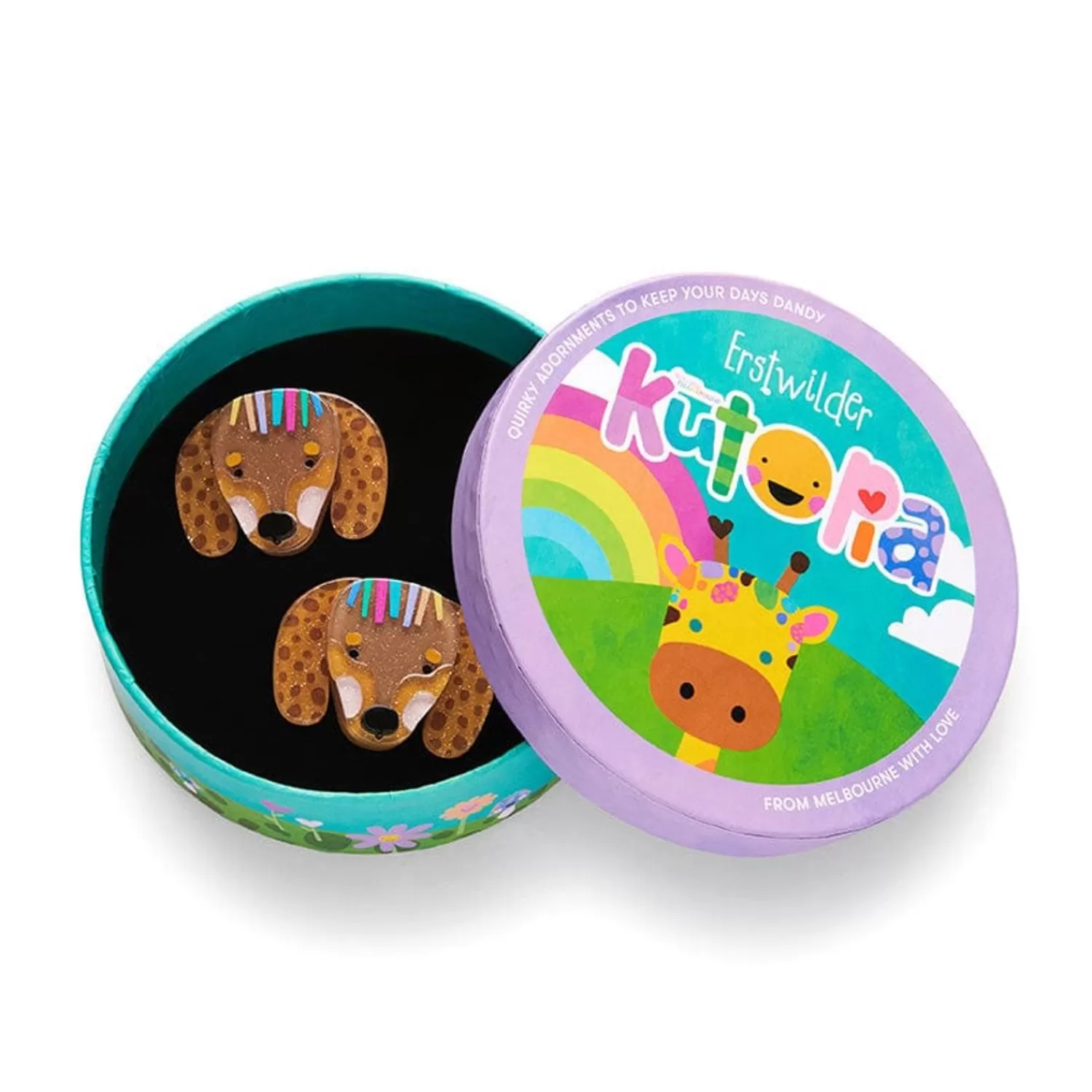 These Erstwilder X Kasey Rainbow Darcy The Dachshund Hair Clips Have Been Hand-Assembled From A Combination Of Colourful Resins And Finished With Hand-Painted Details. A Resident Of The Wonderful World Of Kutopia, Darcy’S Diminutive Size Doesn’T Quite Reflect Her Big Personality. Wear Her With Her Matching Brooch Or When Carrying Around Her Complementary Compact To Complete The Ensemble.