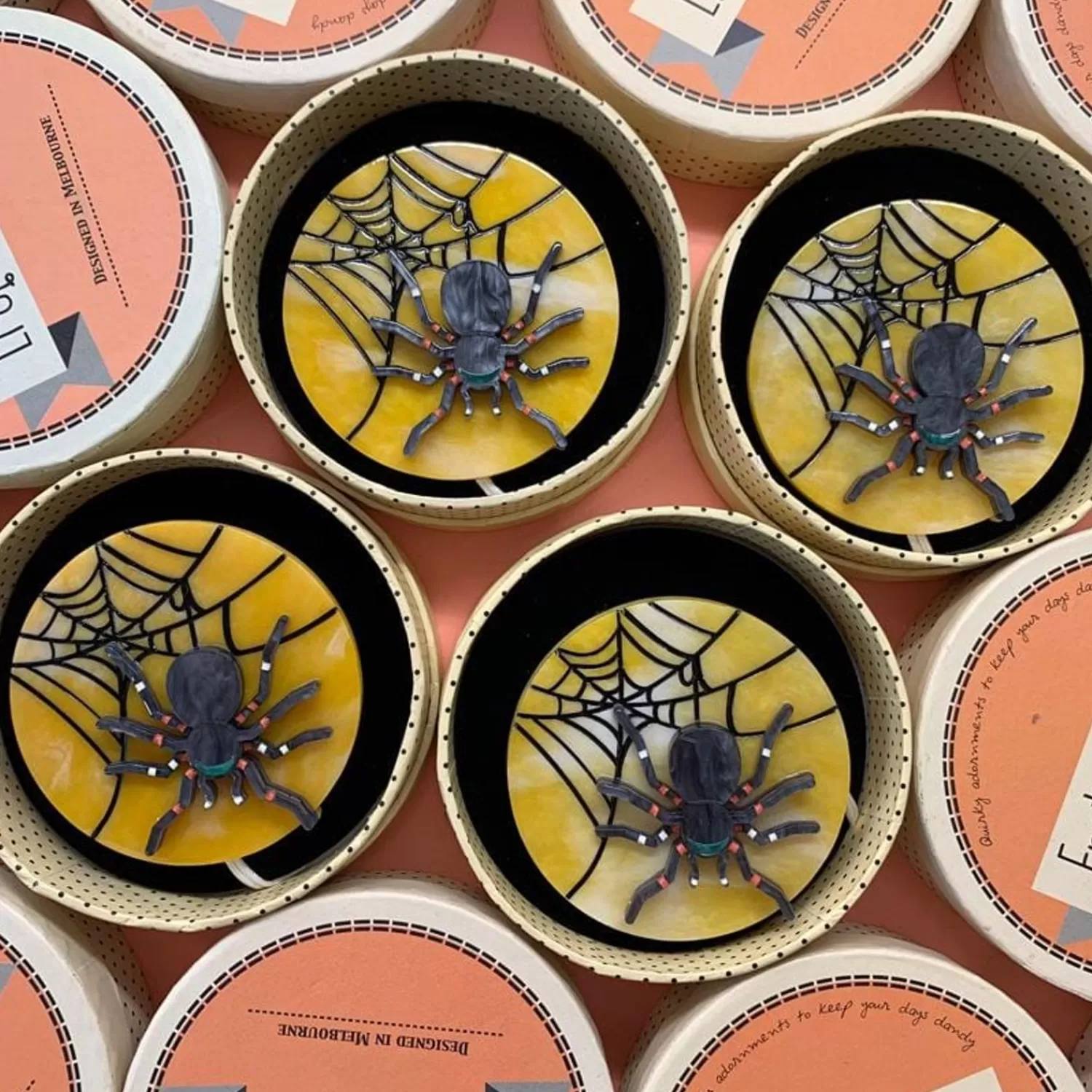 If You Find Yourself By Any Water Spouts, You Might Meet Our New Friend. With A Combination Of Textured Resins And Hand-Painted Details, This Little Spider Has The Perfect Autumn Pallet For All Your Halloween Needs. Pair With Our ‘On Haunted Hill’ Brooch For Some Circular, Spooky Season Dressing.