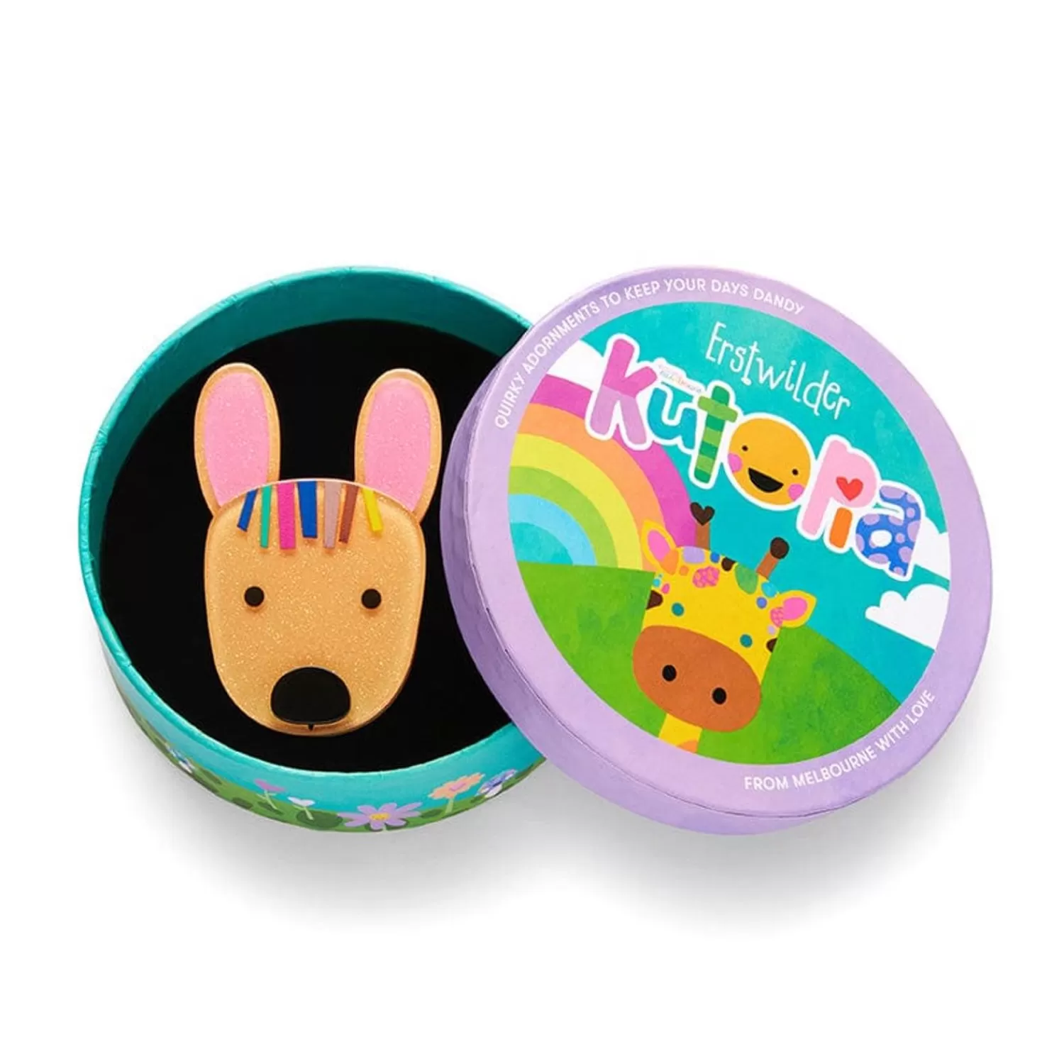 This Erstwilder X Kasey Rainbow Kaye The Kangaroo Brooch Has Been Hand-Assembled From A Combination Of Colourful Resins And Finished With Hand-Painted Details. A Resident Of The Wonderful World Of Kutopia, Kaye Has Turned Caring About Her Fellow Critters Into An Art.