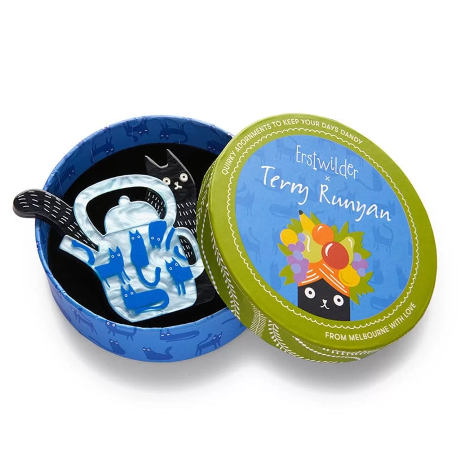 Here’S The Tea, This Hand-Assembled Cat And Curious Teapot Brooch Has Been Brought To Life As An Art Accessory Thanks To A Terrific Terry Runyan Design And The Erstwilder Touch. With Hand-Painted Details Adding To The Fun, Mouse Tea Is Also Available As An Enamel Pin But Works Just As Well When Paired With Any Of The Aspirational Kitties In This Collection.
