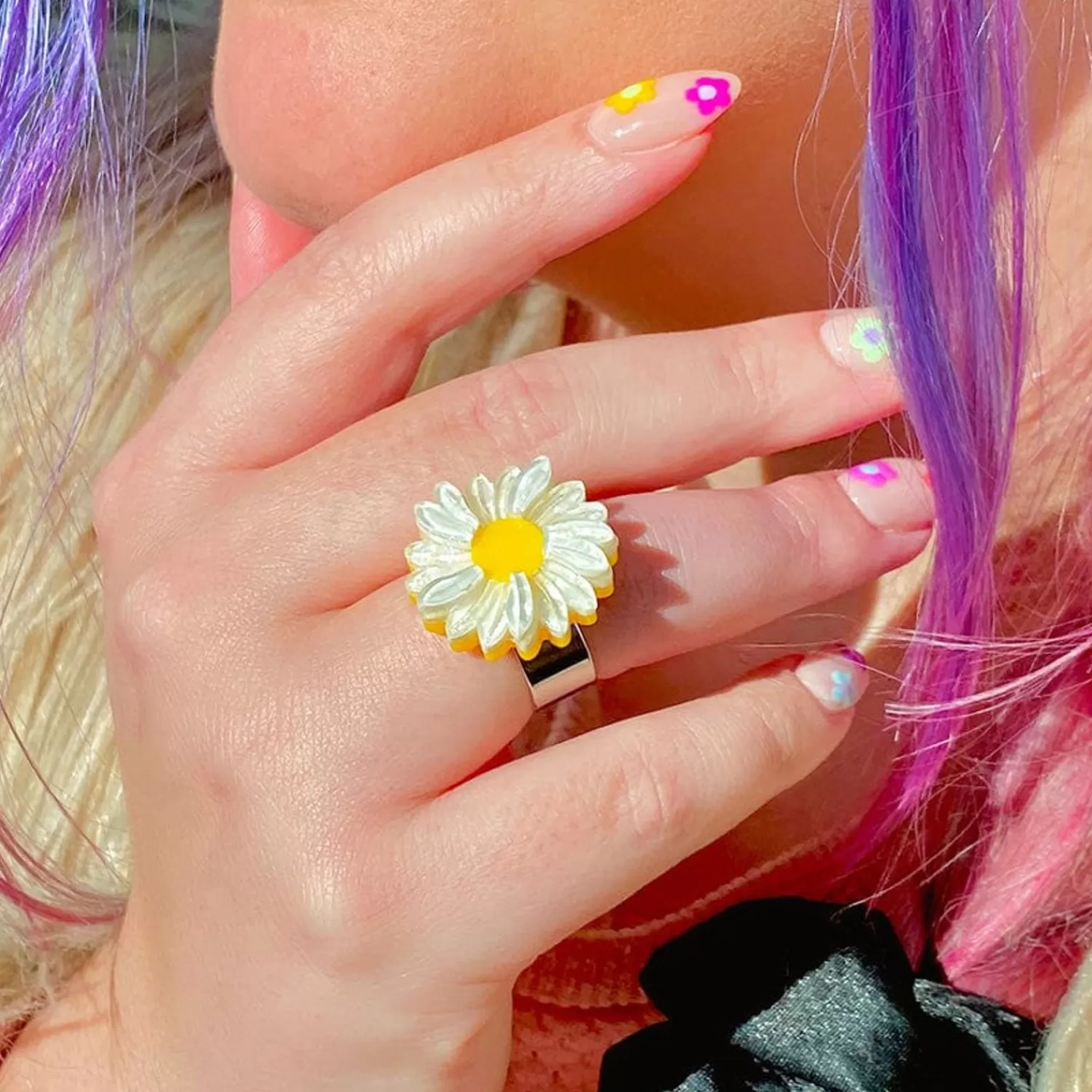 She Loves Me, She Loves Me Not! Hand-Assembled From A Combination Of Striking Solid And Subtle Textured Resins, Our Daisy Flower Statement Ring Will Provide Everlasting Beauty In A Way That The Real Thing Can’T Compete.