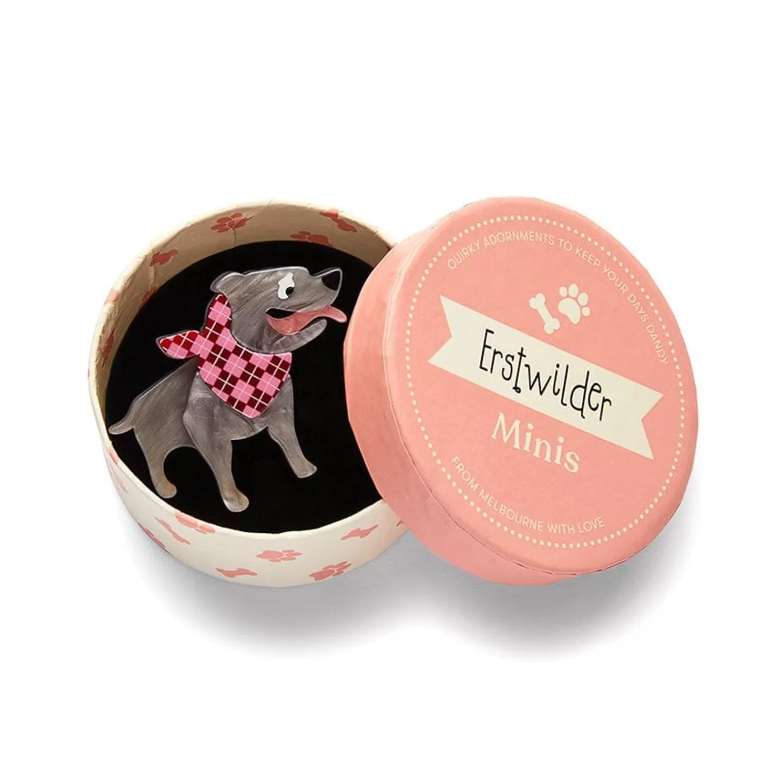Staffy Stan Returns Once Again With All Of His Personality, And A Fancy New Printed Scarf, But This Time Shrunken Down To Erstwilder ‘Mini’ Brooch Size. A Perfect Pooch To Complete Any Outfit, Staffy Can’T Wait To Meet You! Shop This Delightful Dog Brooch For Yourself Or Make It A Meaningful Gift For Any Staffy Lover In Your World. Available Strictly While Stocks Last.