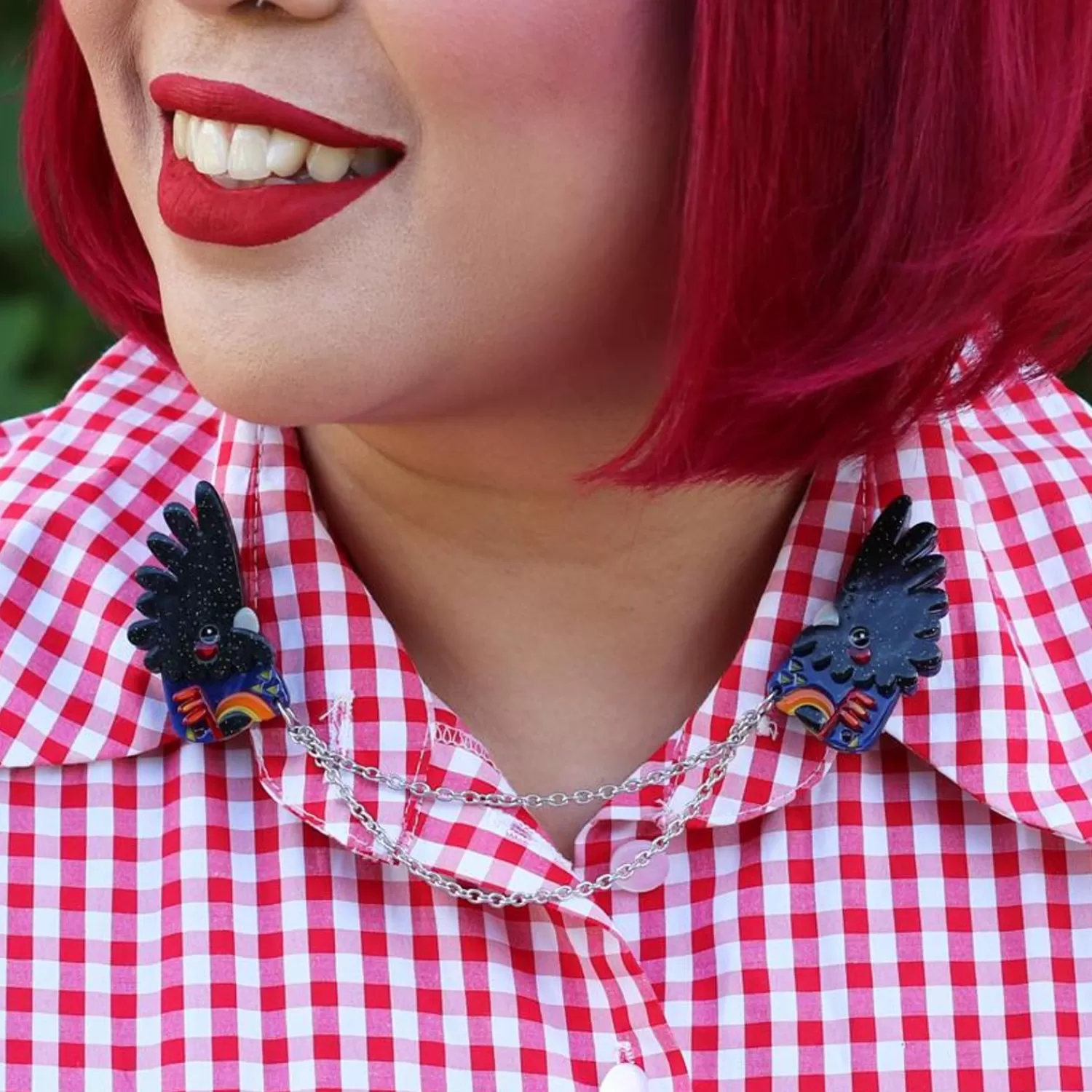 With A Bright Pop Of Colour, Our Rare Red-Tail Cockatoo Cardigan Clips Feature Black Glitter Resin As A Wonderous Contrast To A Collection Of Bright Textured, Hand-Assembled Details. Somehow Both Demure Yet Energetic And Bold, Erstwilder X Pete Cromer Is All About Feathery Fashionistas!
